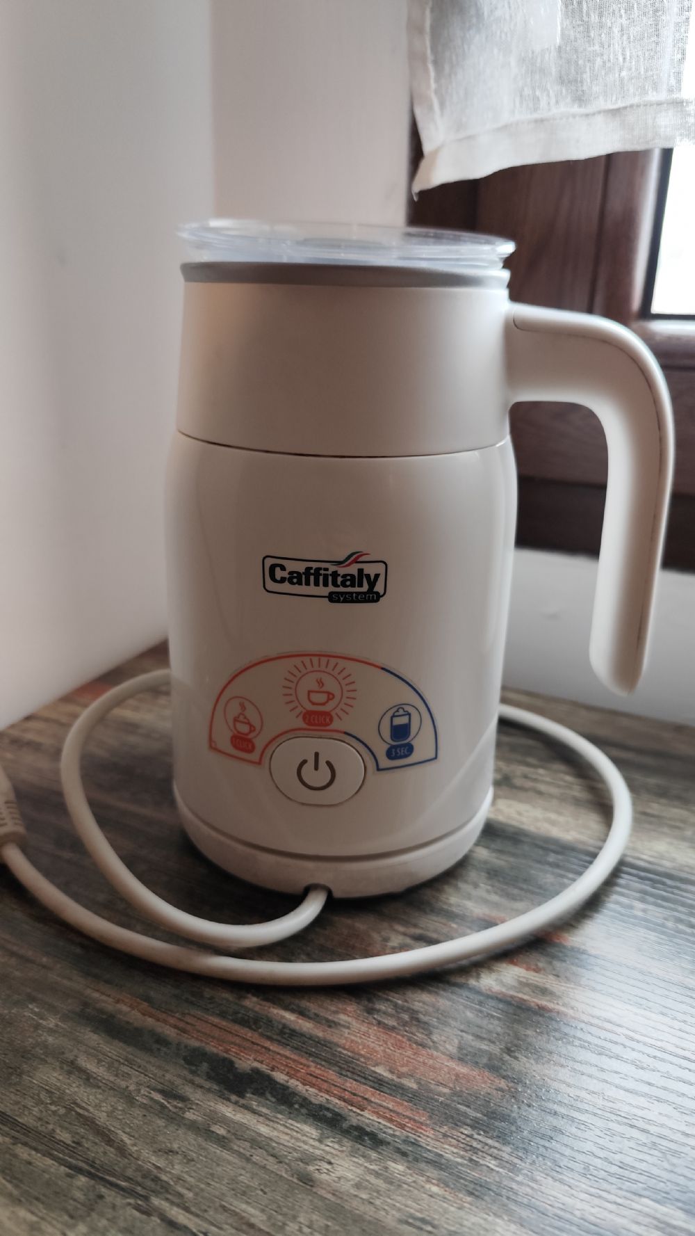 Descrizione:Nontalattte marca Caffitaly, usato tanto ma perfettamente funzionante, l'interno è un po' rovinato nel rivestimento in alluminio. Si può usare con latte o con bevande vegetali, tipo soia o avena (anche con il latte di riso ma non so se "monta"); ha tre funzioni: latte montato per cappuccino (1clic e frullino inserito) latte caldo (2 clic senza frullino), latte montato freddo per cappuccino (clic di 3 secondi con frullino inserito).
