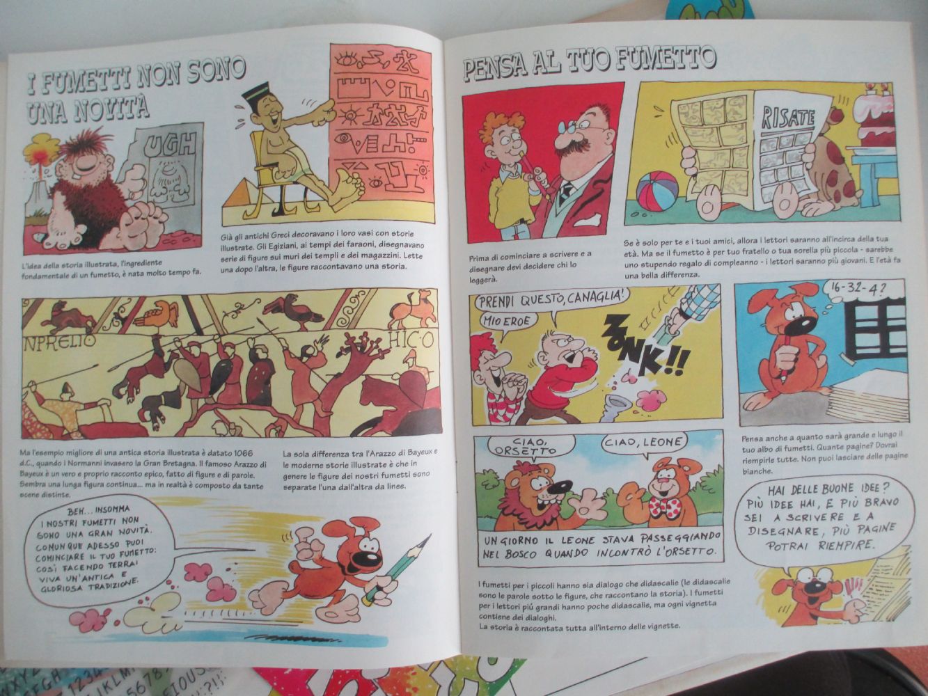 All'interno c'è un fascicolo, dei trasferibili (già un po' usati), fumetti da riempire, schede da copiare, delle forme già pronte per gli "effetti speciali" e una matita.
