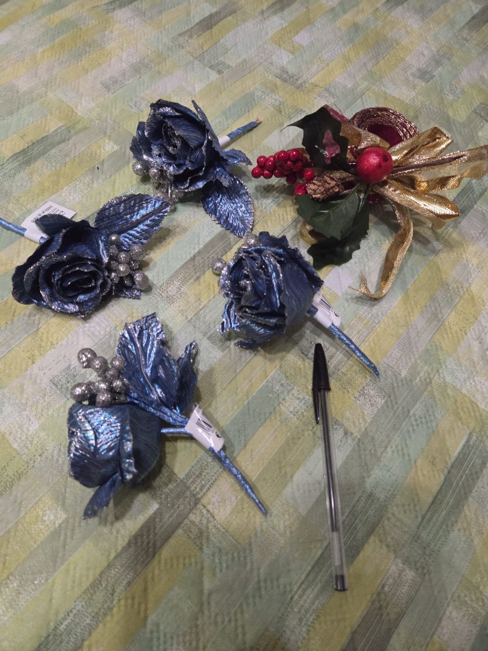 Decorazioni floreali nuove blu e nastro rosso, nuovi
