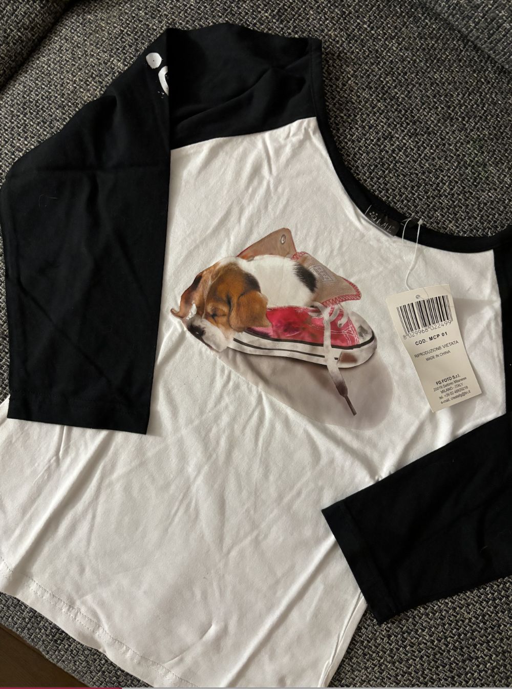 Descrizione:Maglietta in cotone con carinissima stampa cane nella scarpa.