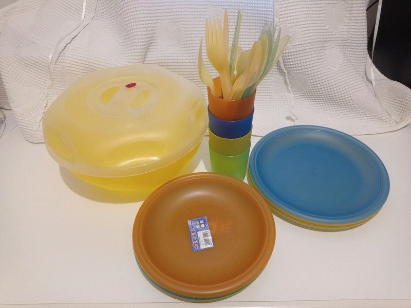 4 bicchieri, 4 forchette, 4 coltelli, 4 cucchiai, 4 cucchiaini, 4 piatti grandi, 4 piatti più piccoli + contenitore esterno con coperchio