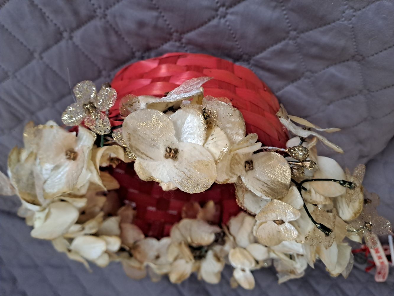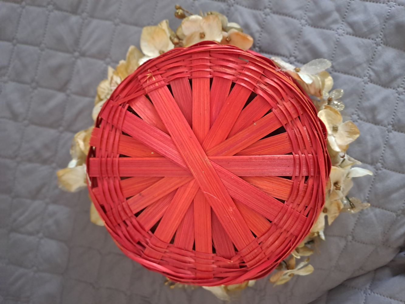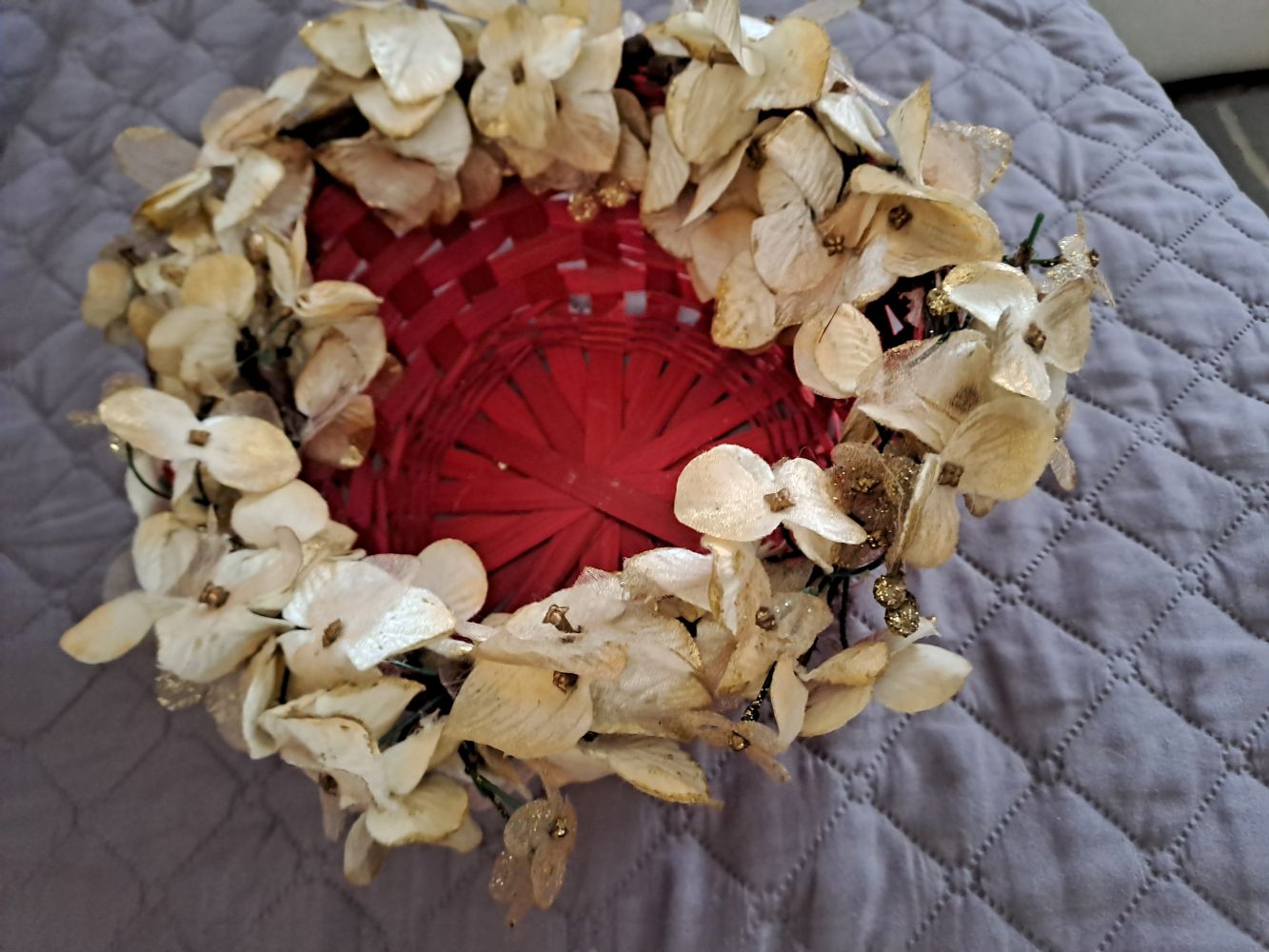 Descrizione:Cesto in legno con fiori finti dorati beige , qualche fiore un pò rovinato ma assolutamente utilizzabile, diametro 20