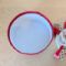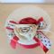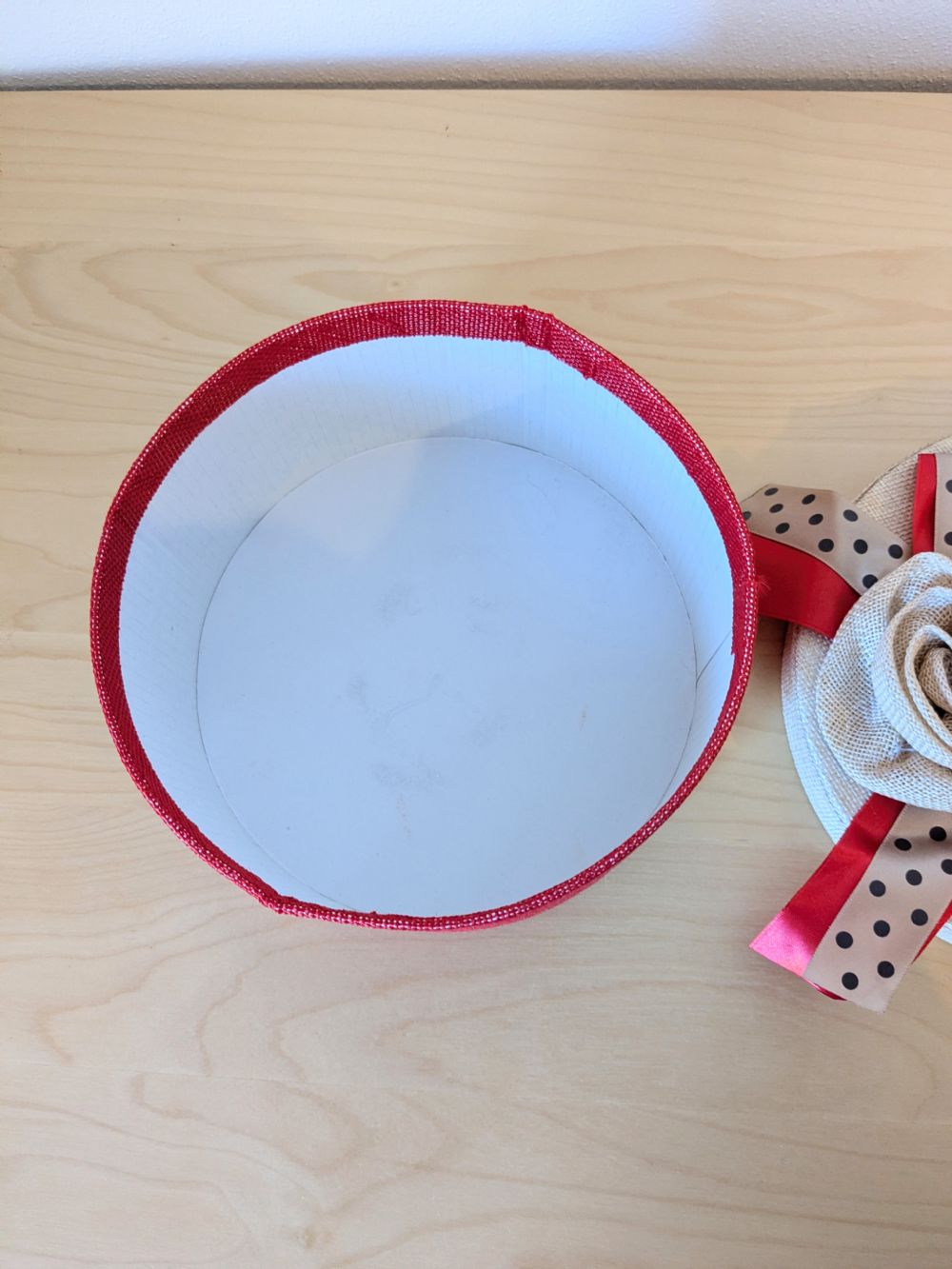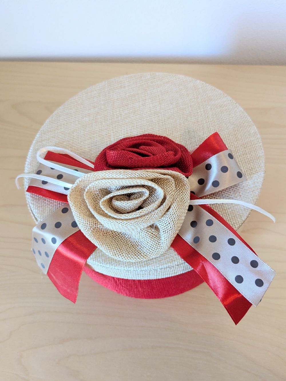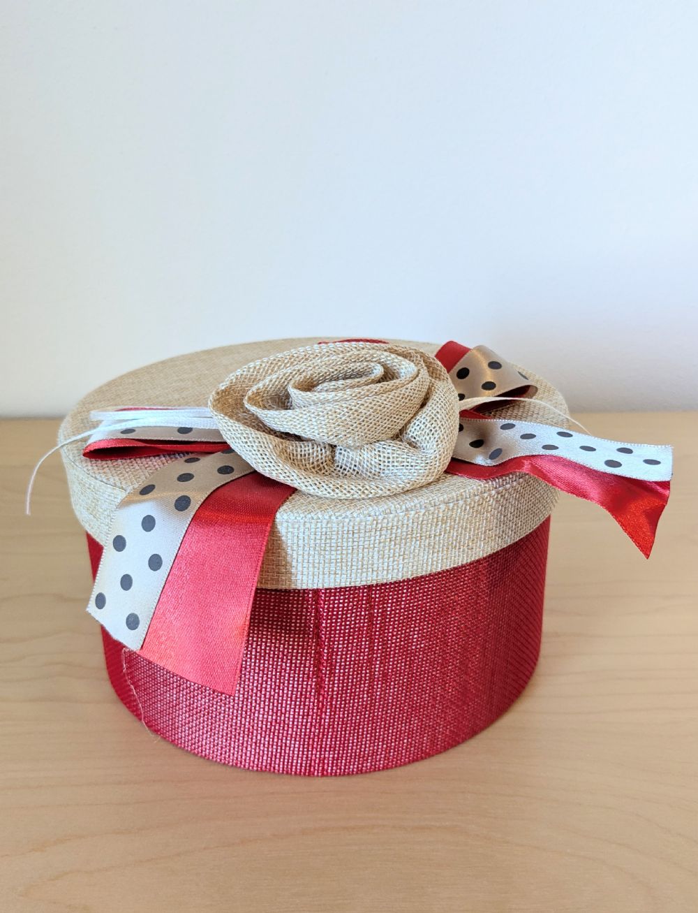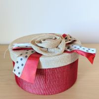Descrizione:Scatola in cartone rigido di forma tonda (diametro cm 18,5) decorata con tessuto a retina rossa e beige, fiori e nastri rossi e beige. Altezza cm 10