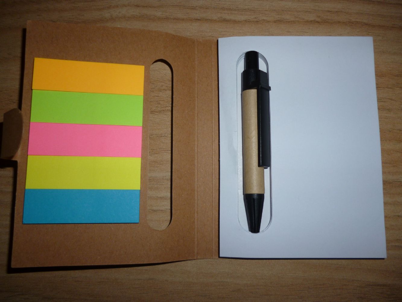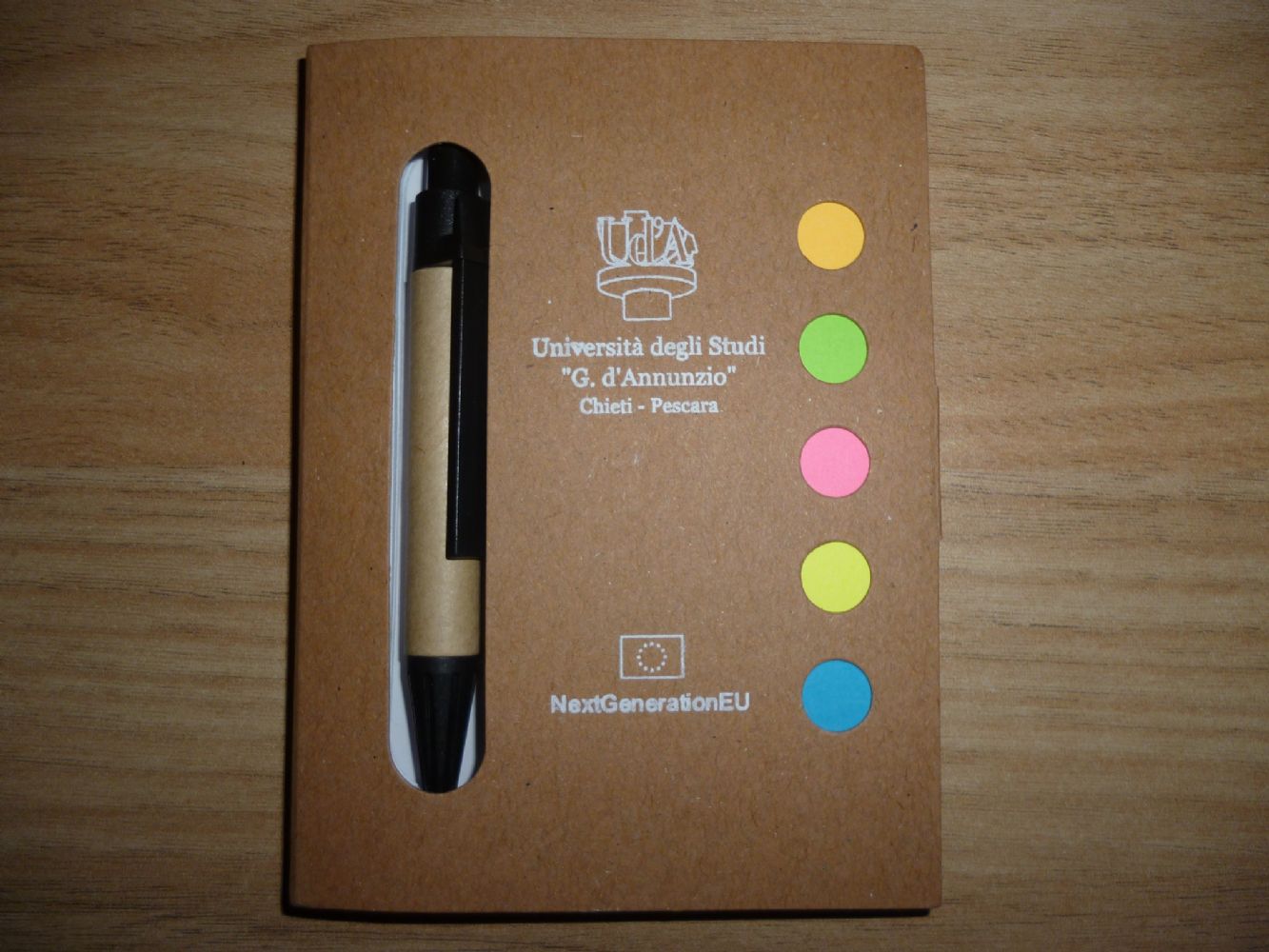 Piccolo bloc notes con segnapagine adesivi e pennina. Il logo Università d''Annunzio è solo sulla copertina. Misure 12x8 cm circa.