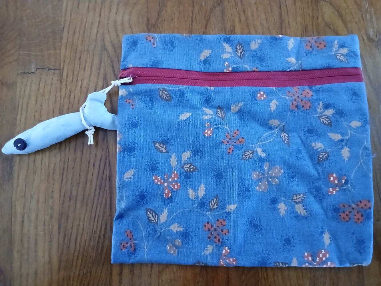 Descrizione:In tessuto, credo sia cotone, immagino sia fatta a mano. Alla cerniera ha applicato un pesciolino il cui occhio è un bottone. Cerniera funzionante. Dimensioni: larghezza 19x altezza 20 cm. Foto 2: il retro.