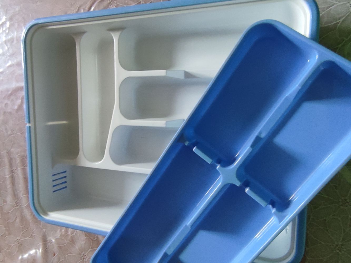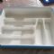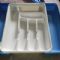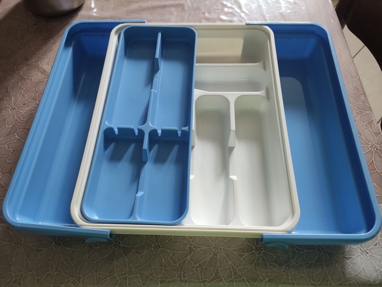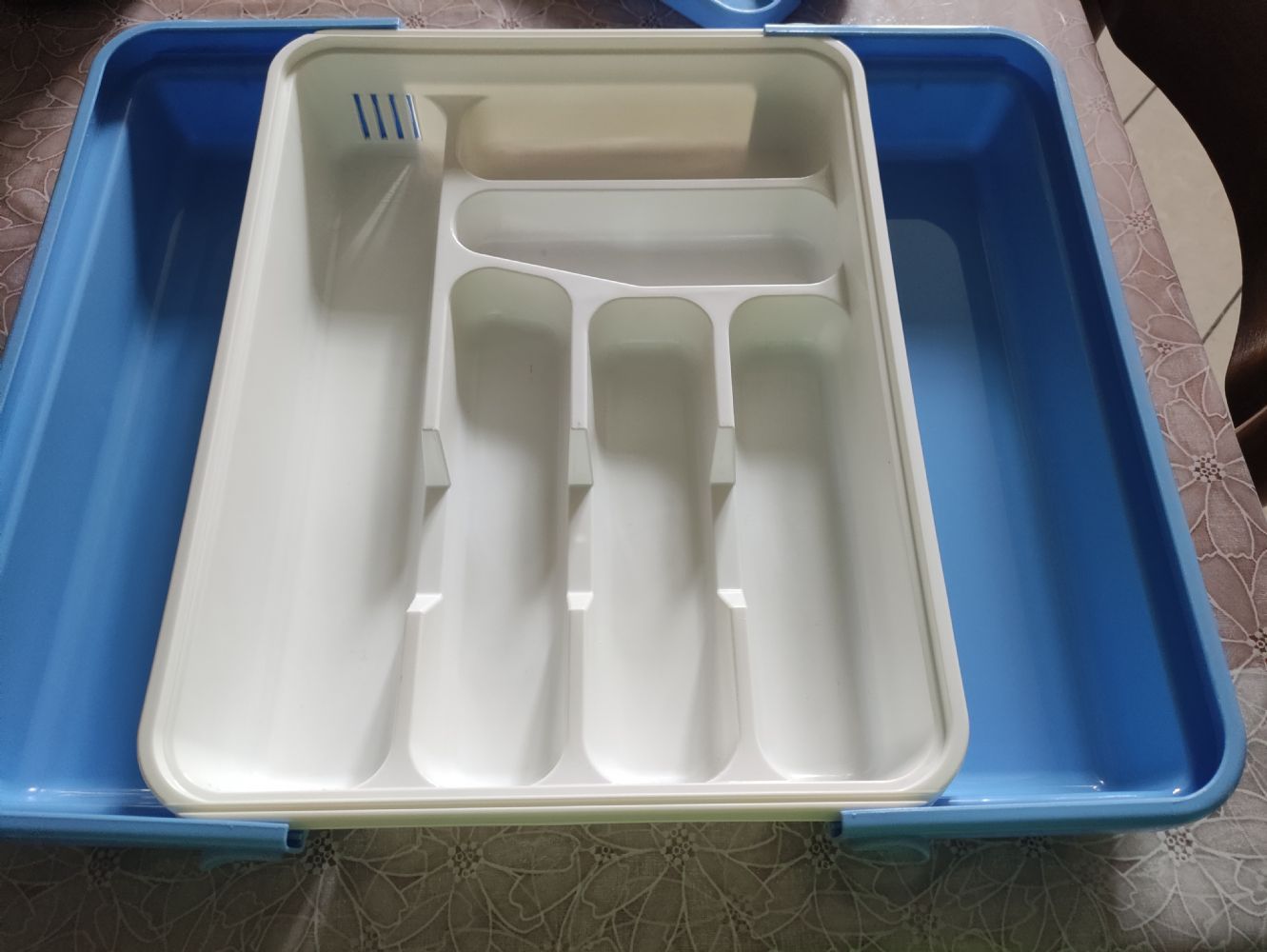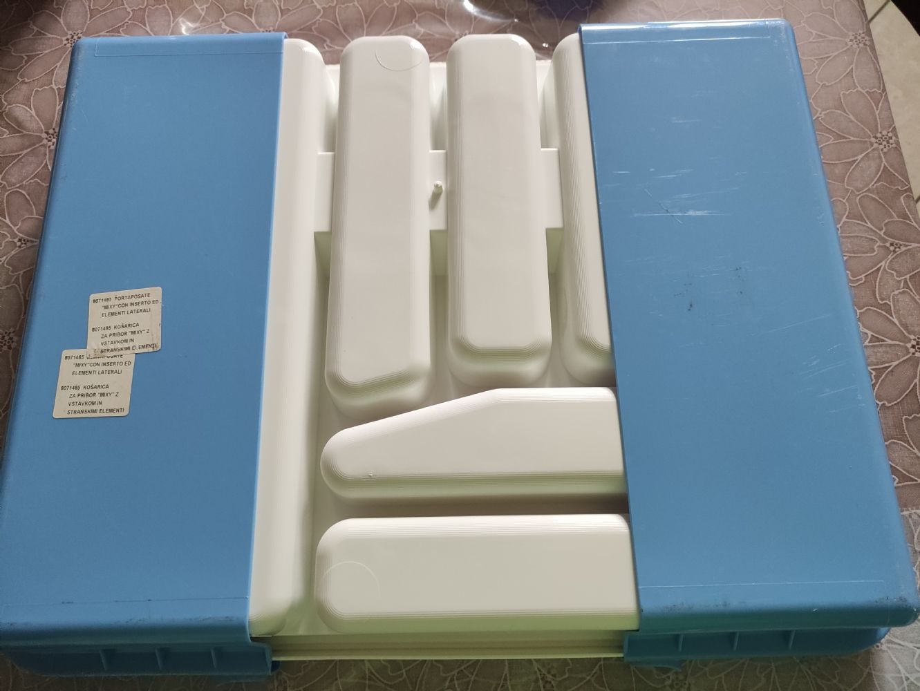 Oltre al portaposate standard ha anche un inserto che si appoggia sopra e due prolunghe laterali che permettono di adattarlo a cassetti più grandi e larghi, creando due ulteriori scomparti laterali.