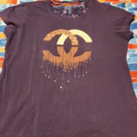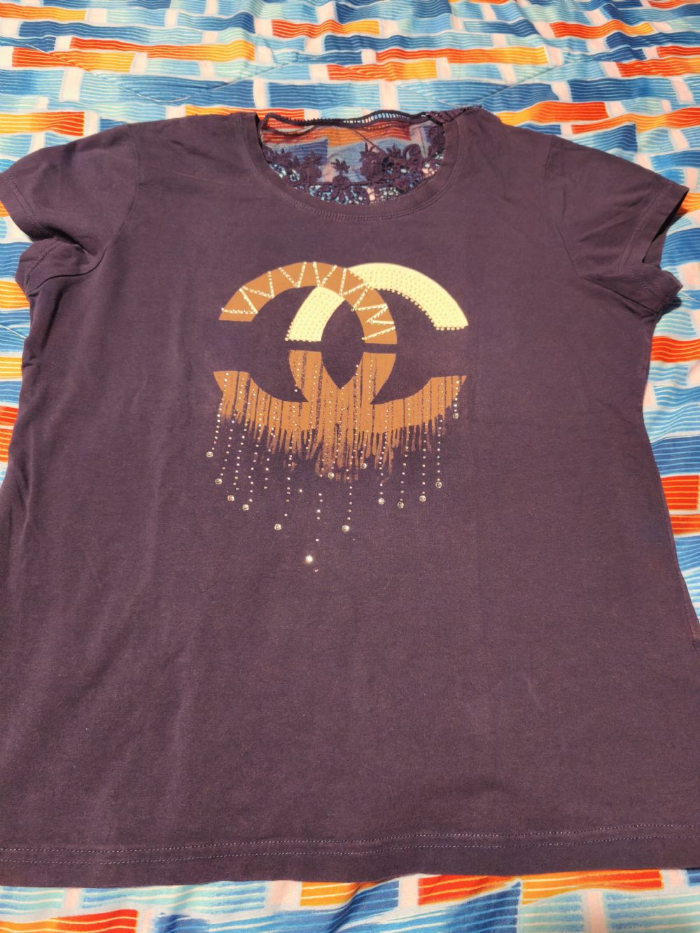 Cotone ed elastan, con pizzo dietro allo scollo, strass sul disegno davanti, spalle cm 39, ascelle cm 50, lunghezza cm 60.