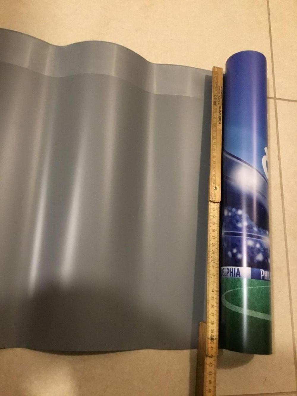 Descrizione:Strisce in materiale plastico flessibile, con immagini promozionali sul fronte, completamente grigie sul retro dove c’è nella parte alta una parte adesiva togliendo la bandella che la ricopre.