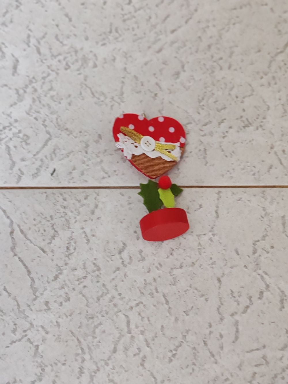 Descrizione:Portafoto, portabiglietto o segnaposto natalizio legno, metallo e feltro. 10 cm circa