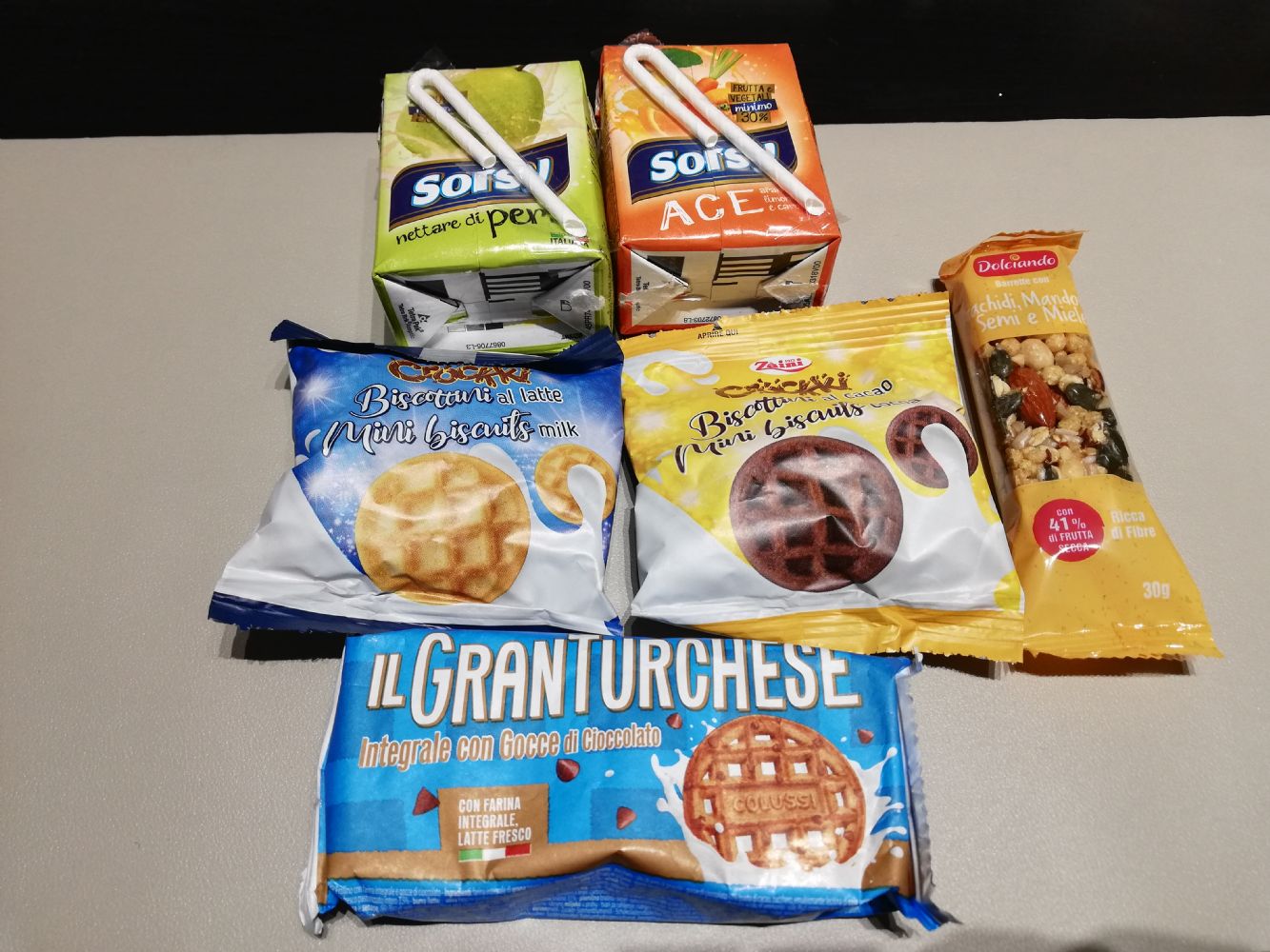 Descrizione:Lotto di 2 succhi scadenza maggio 2027 e agosto 2026, biscotti zaini scad giugno 2026, granturchese scad giugno 2026,barretta mandorle scad settembre 2026.