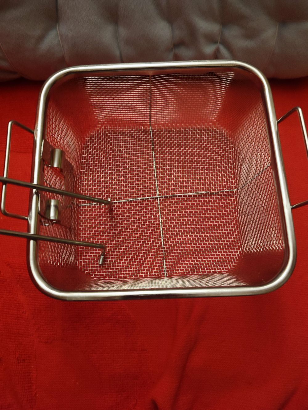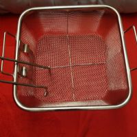 Descrizione:Cestello per friggere cn manico estraibile misura 20x20x8 acciaio.