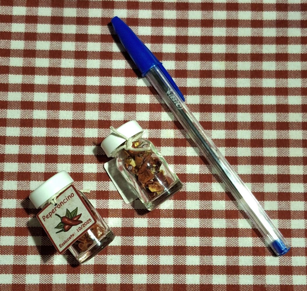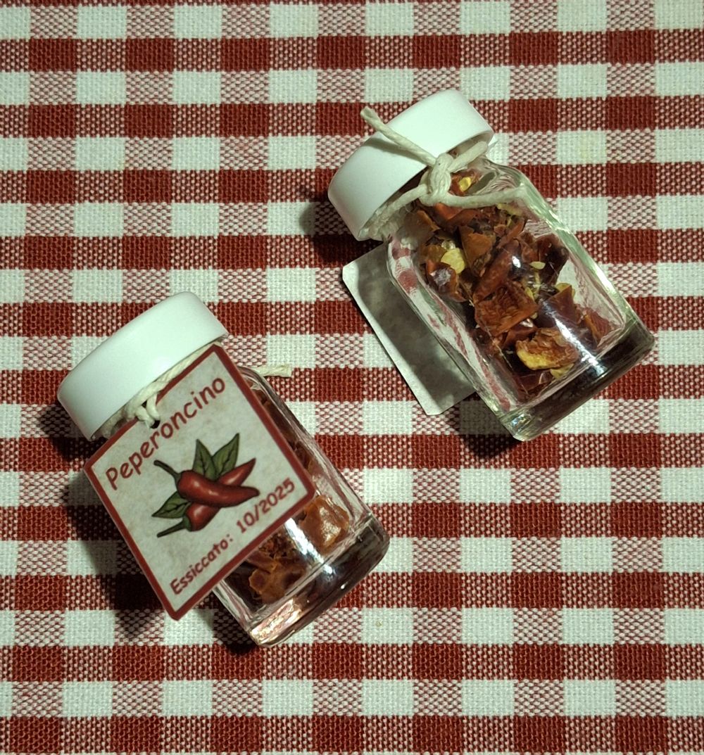 Peperoncino coltivato nell''orto ed essiccato da me, è tanto per l''utilizzo saltuario che ne facciamo in casa e una parte la scambio in mini flaconi di vetro con chiusura ermetica.