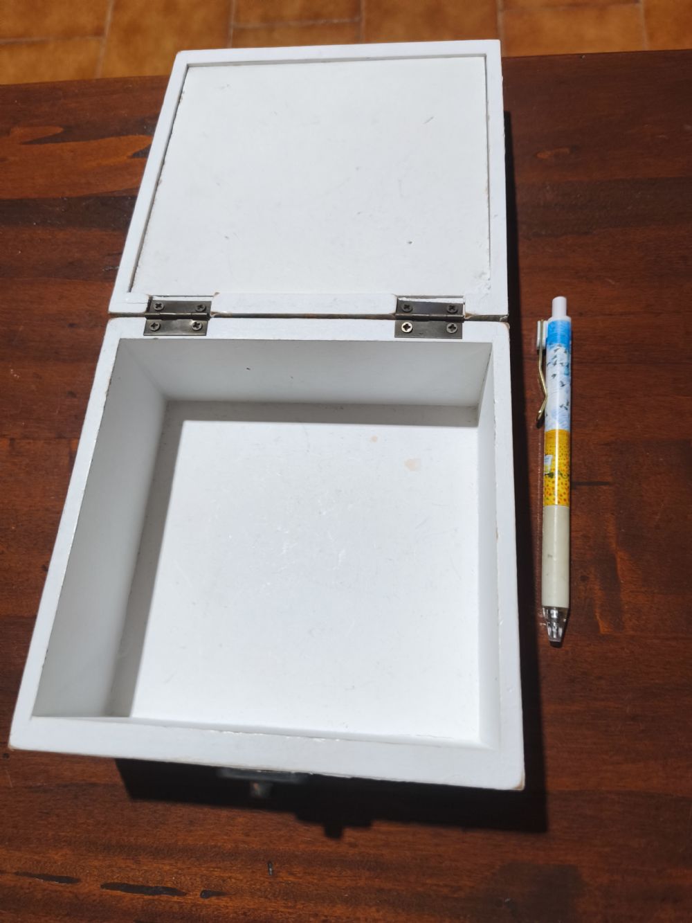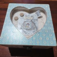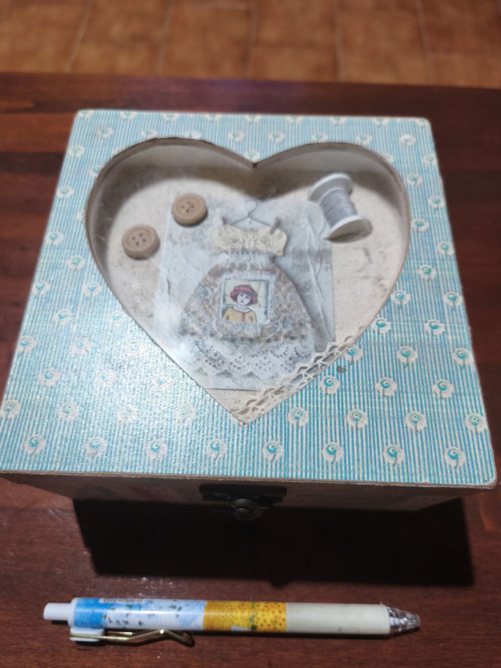 In legno, con finestra a forma di cuore con dentro oggetti che ricordano il cucito.
