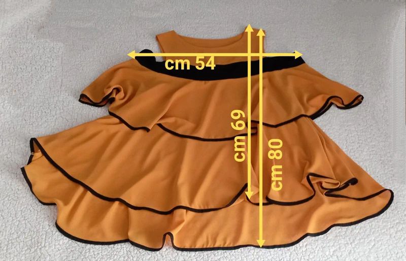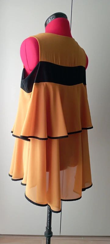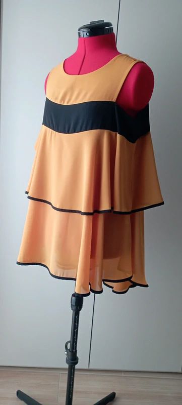Descrizione:Blusa modello a balze, con spalle scoperte e girocollo. Molto bella e particolare in un bel colore giallo scuro con bordi neri e fascia nera che gira intorno alle spalle. Le braccia restano coperte dalla balza. Orlo al fondo più corto avanti rispetto al dietro.