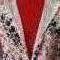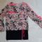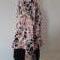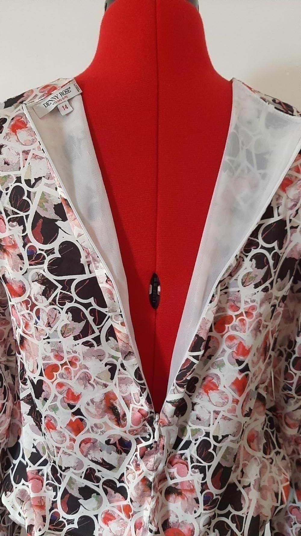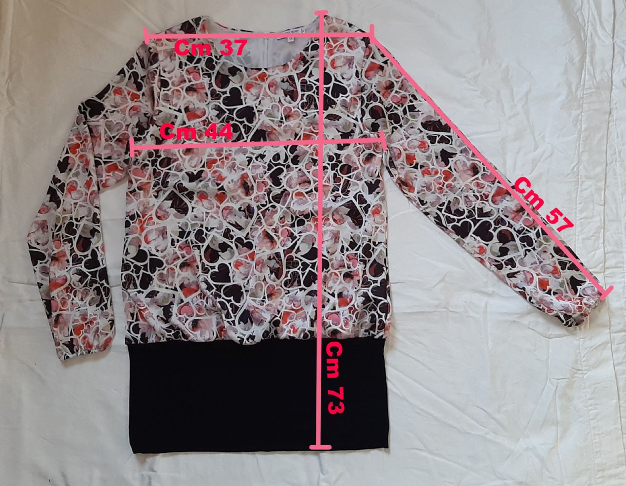 Modello un po' largo, con scollatura girocollo, maniche arricciate ai polsi e fascia in vita in jersey, tessuto con stampa di cuori sui toni del rosa e del nero. Internamente è foderata. e dietro ha una zip invisibile lunga.