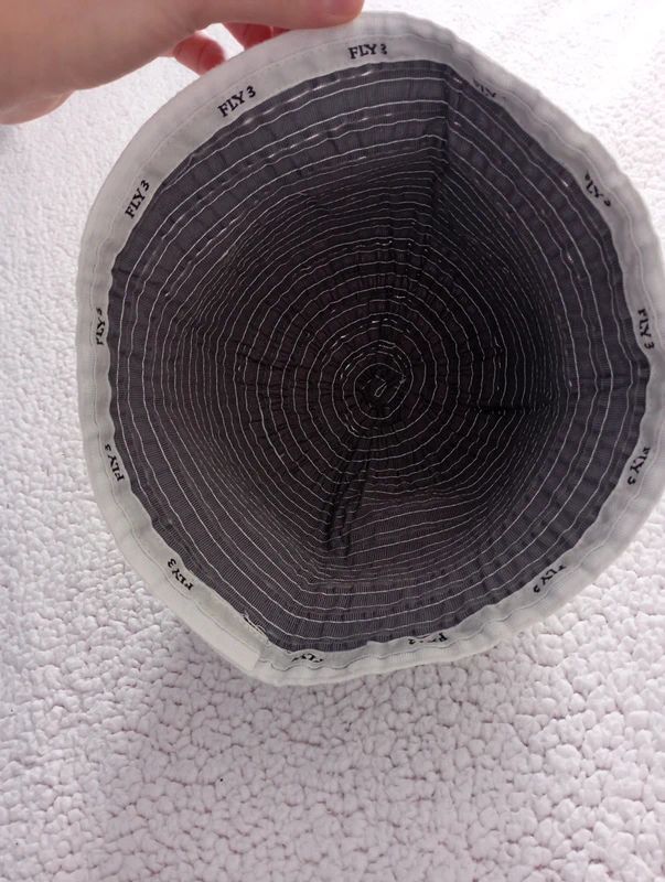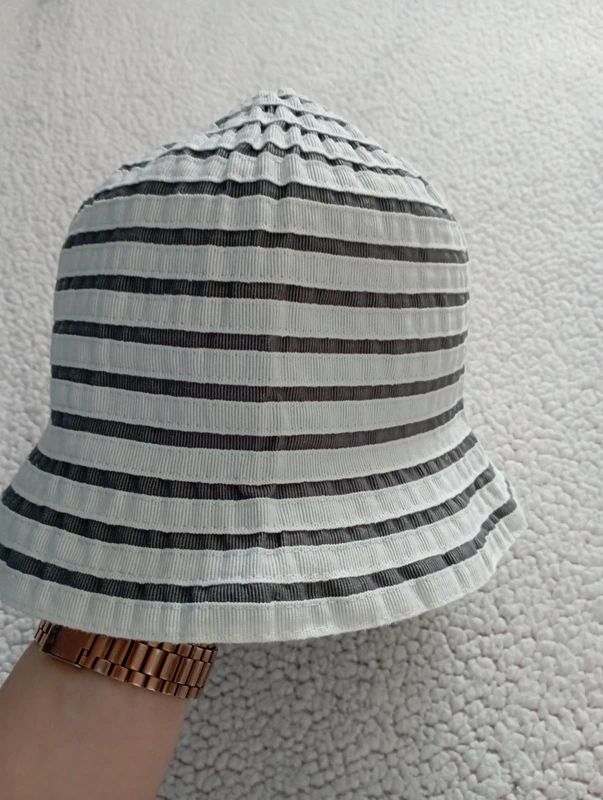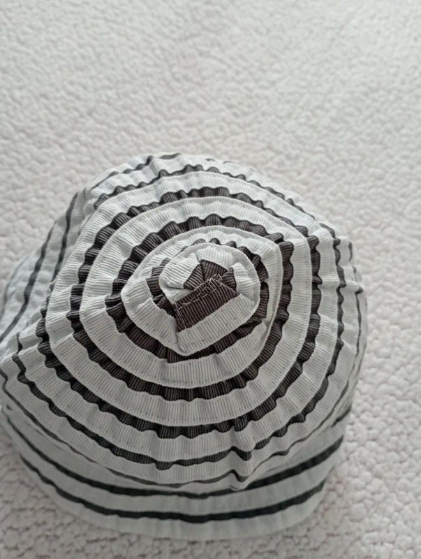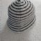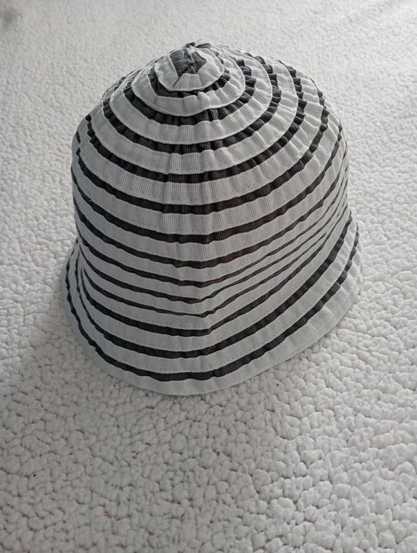 Descrizione:Cappello alla pescatora cucito con nastro gros grain bianco e grigio alternato.