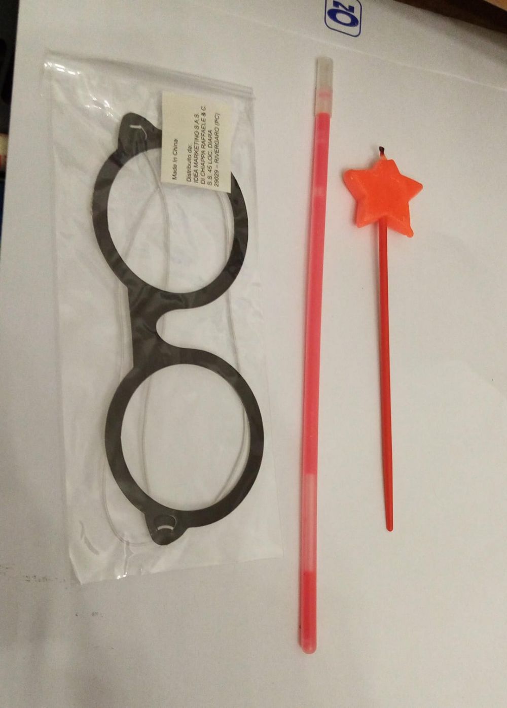 Un paio di occhiali di cartone con l''elastico Un bracciale credo flou, ma non so come funziona Una candelina stellina