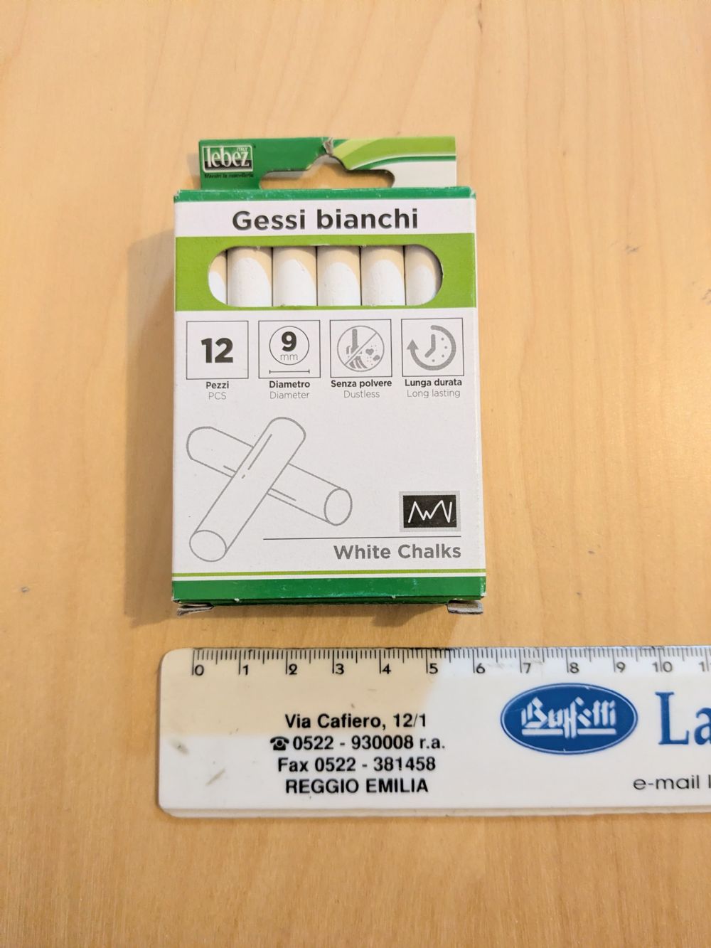 Descrizione:Confezione nuova di 12 gessi bianchi diametro 9 mm marca Lebez
