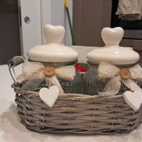Descrizione:2 barattoli di vetro con tappo di ceramica e cestino vimini. Tenuti anni in esposizione i barattoli sono alti 18 cm circa e il cestino è lungo 25 cm