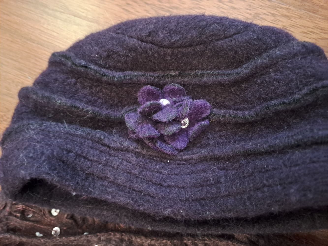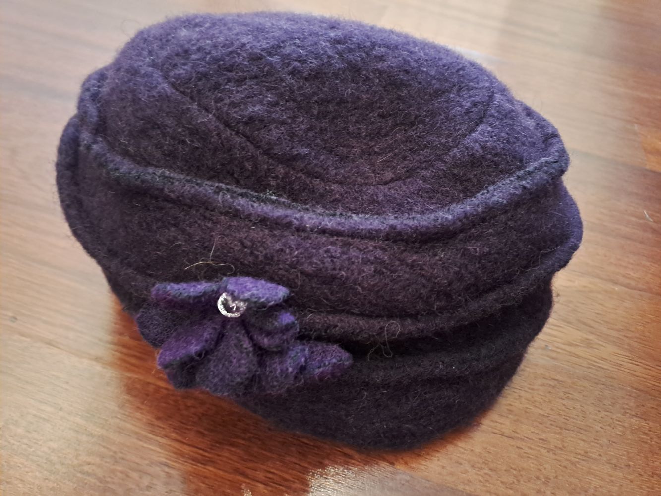 Descrizione:Cappello in lana cotta con fiore color viola scuro