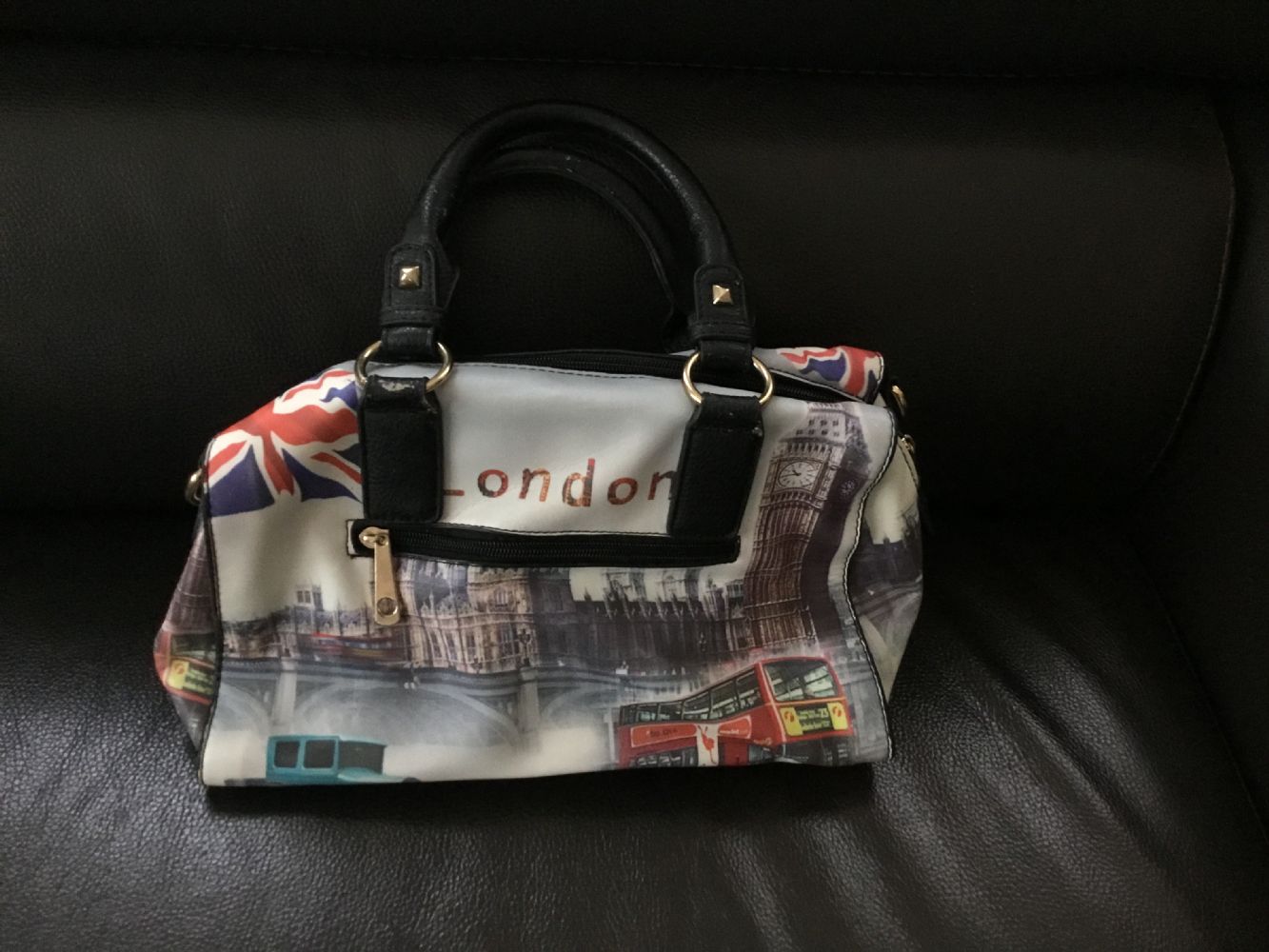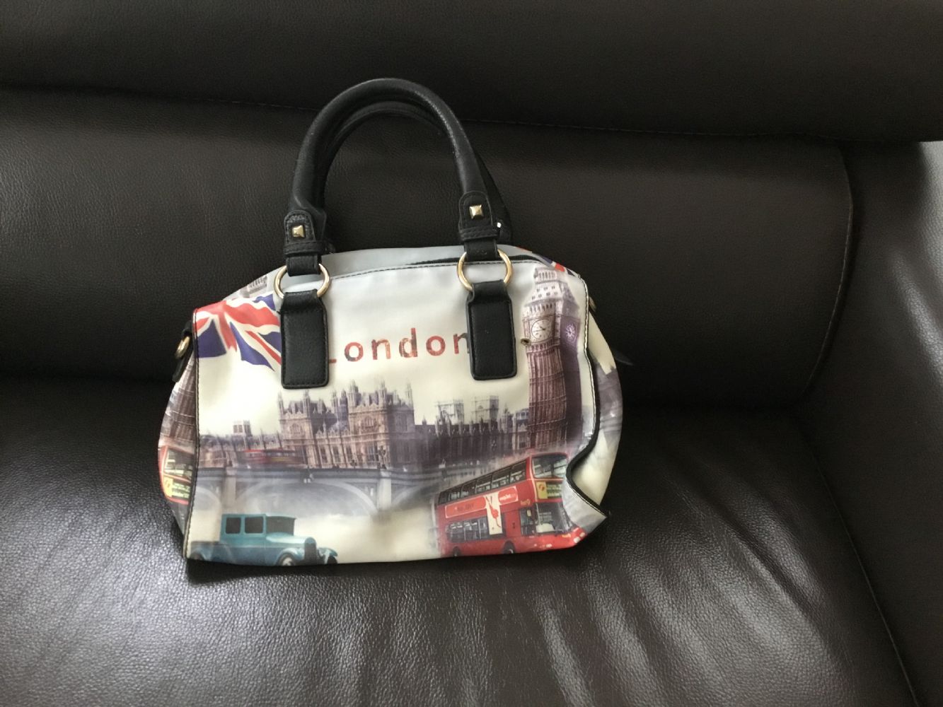 Descrizione:Borsa a bauletto di media grandezza, con fantasia in stile londinese. Fodera interna nera in poliestere provvista di due tasche chiuse da cerniera + 2 piatte aperte. Una tasca con cerniera anche su uno dei fronti esterni.