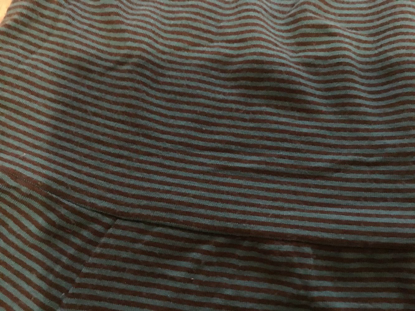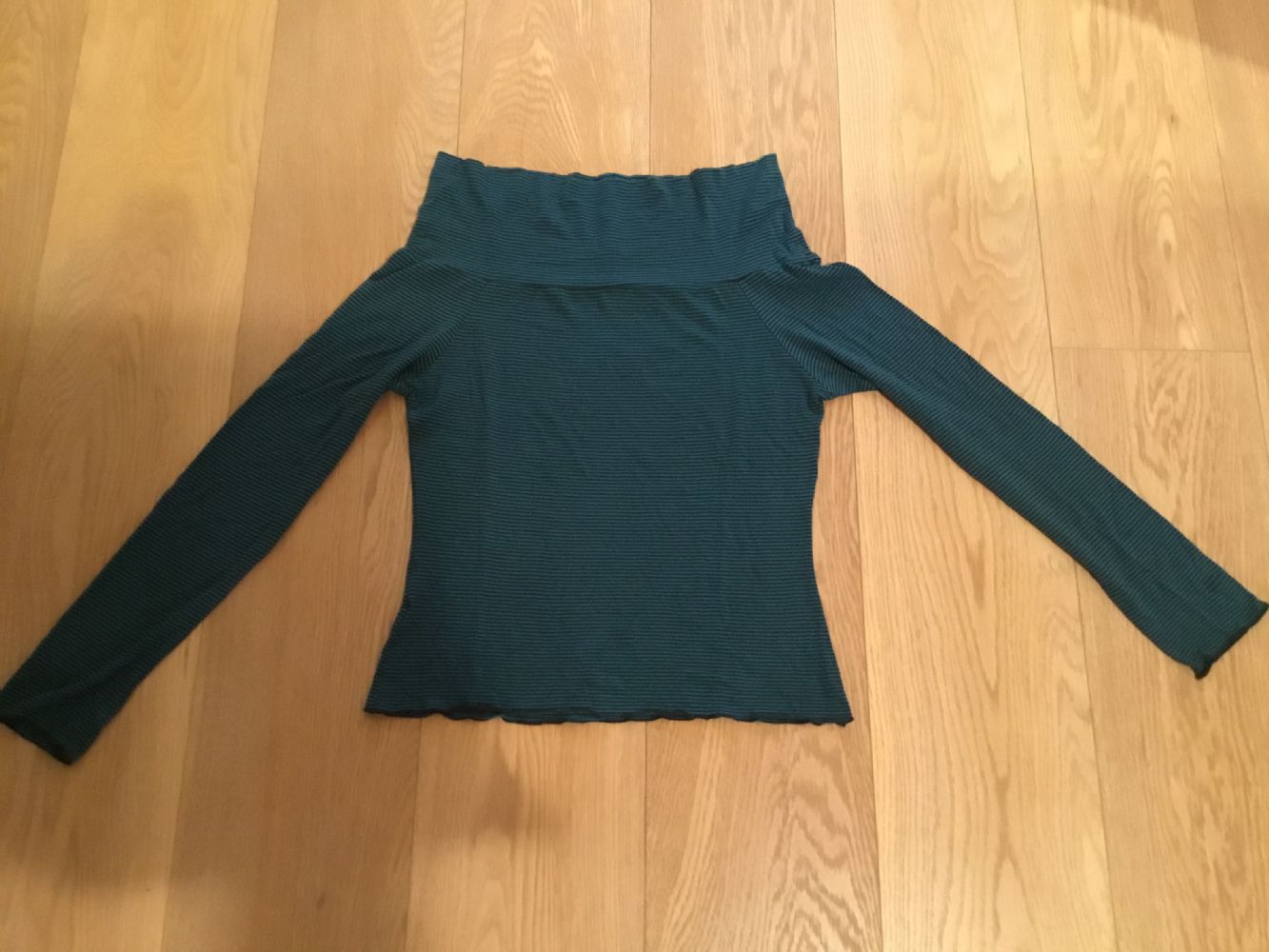 Descrizione:Magliettta a righe sottili verdi e nere, nata per essere portata scesa sulle spalle, ma se portata più su ha un collo largo ad anello e diventa più corta.