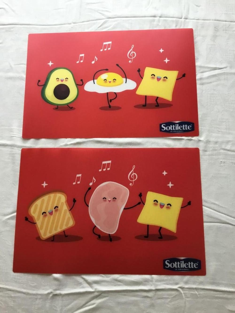 Descrizione:2 simpatiche tovagliette logate Sottilette. Sfondo rosso e i disegni in foto sul fronte, retro tutto rosso. Le due tovagliette sono simili ma non uguali, come si può vedere dalla foto.