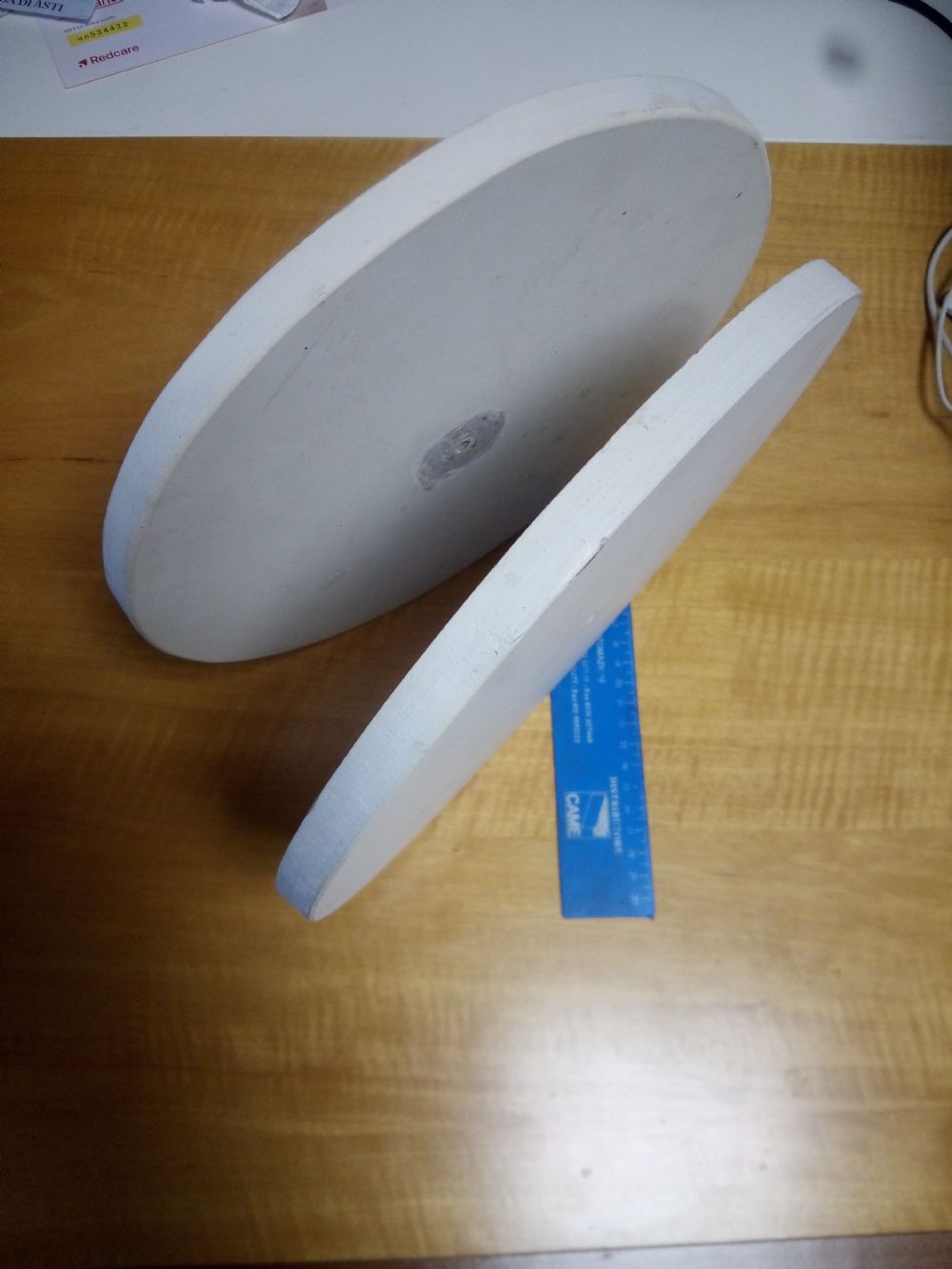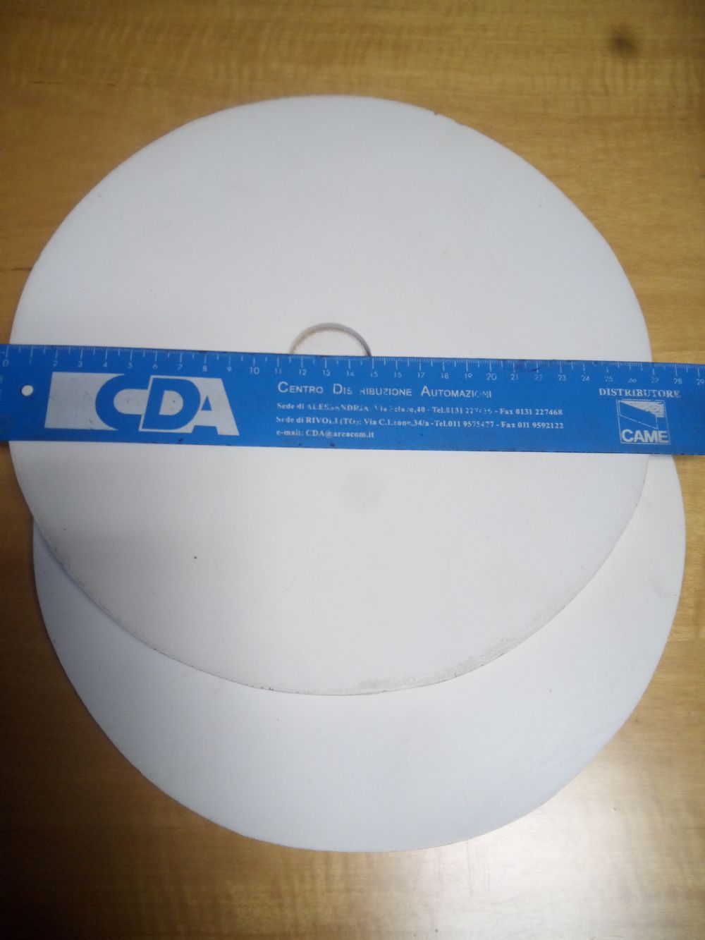 Descrizione:2 dischi di legno di colore bianco con diametro di cm 27 e uno spessore di 1,5 cm .