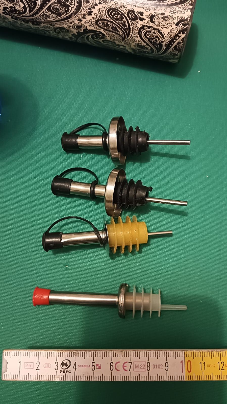 Descrizione:dosatori olio che si applicano sulel bottiglie per fare "il filo d'olio".Metallo che potrebbe essere inox e plastica