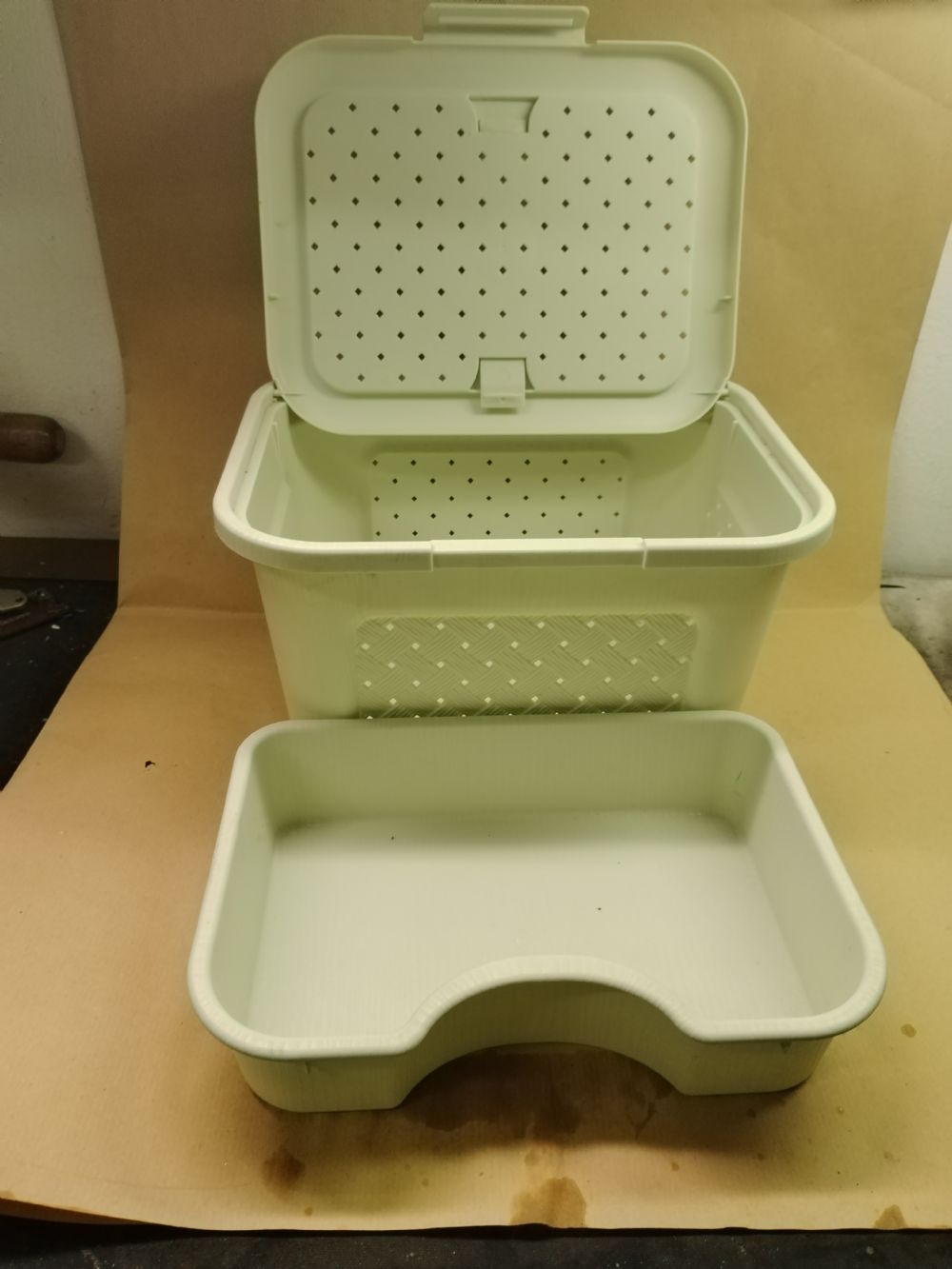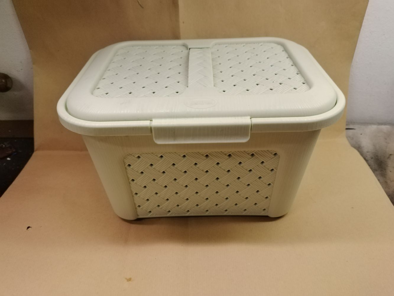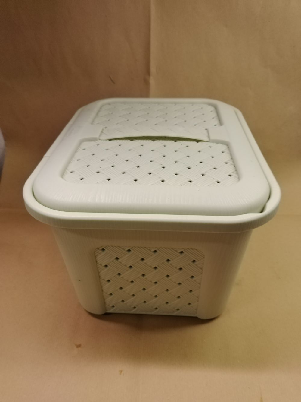 Descrizione:Cestino in plastica verdino con manico e scomparto interno estraibile con clip di chiusura