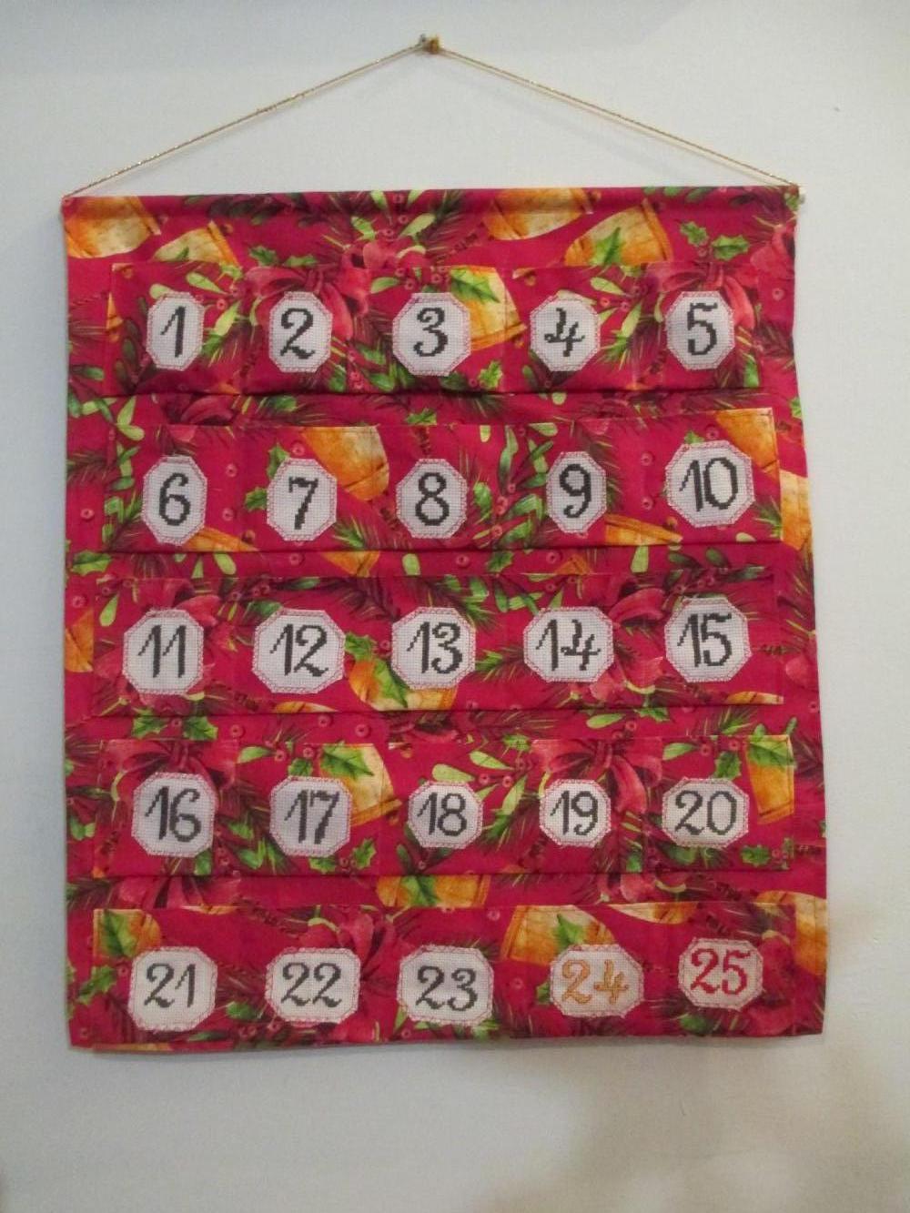 La stoffa per la struttura e le tasche è quella che si usa per fare i lavori di patchwork. Ho ricamato, su stoffa aida in punto croce, i numeri partendo dal primo di dicembre fino al 25.