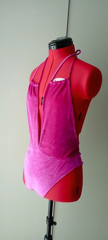 Modello particolare che lascia la schiena totalmente scoperta e con profonda scollatura davanti. Interamente foderato in tessuto bianco.
