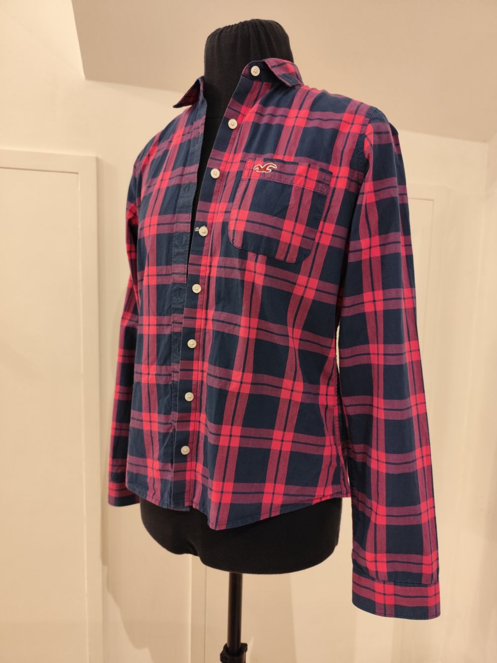 Descrizione:Camicia da donna Hollister. Modello classico, sagomato in vita, con taschino e fantasia a quadri fucsia e blu. Molto bella e versatile, tessuto di ottima qualità.