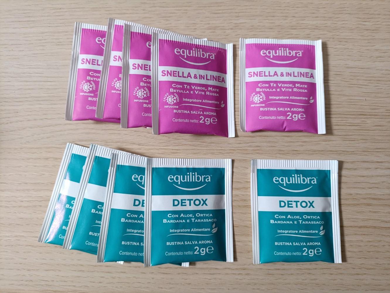 5 bustine tisana detox e 5 bustine tisana snella e in linea, marchio Equilibra. Non vedo scadenza ma sono recenti