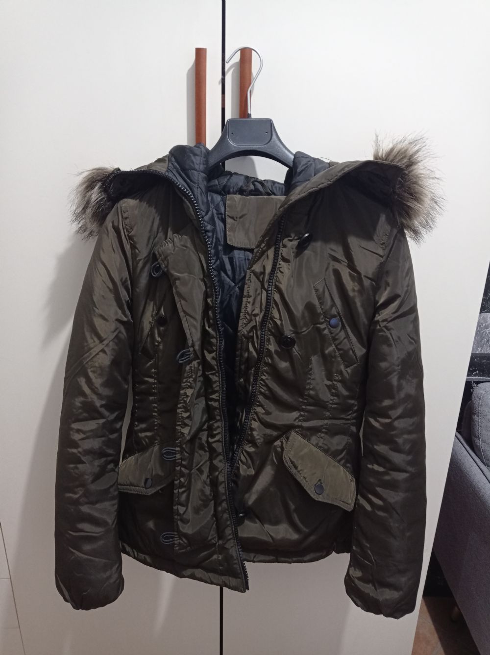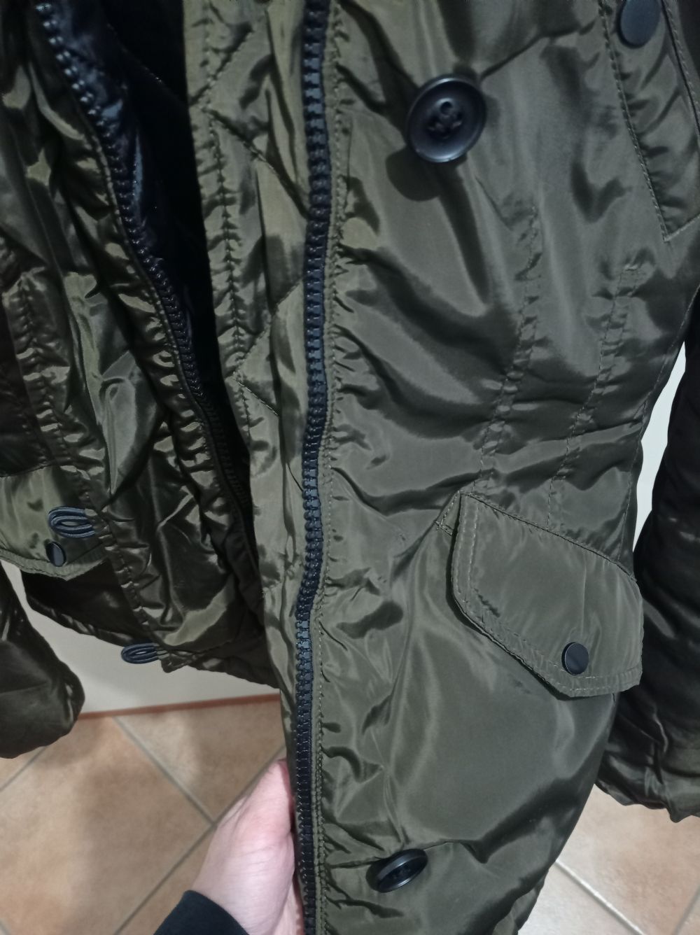 "Usata tanta" perché manca un bottone, ma non è necessario per chiudere la giacca perché c'è la cerniera
