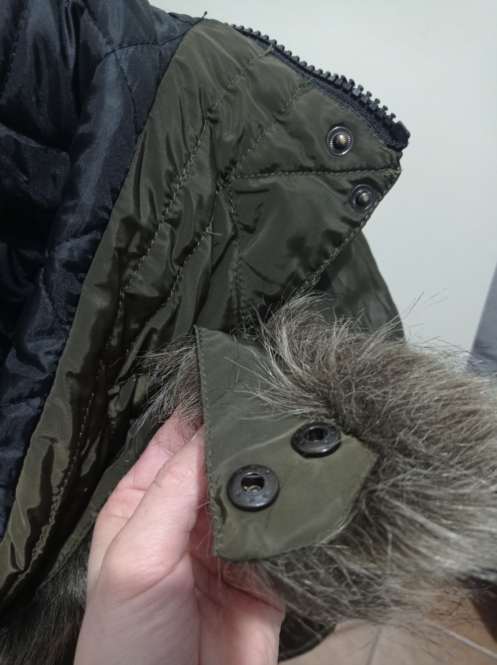 Cappuccio (non rimovibile) con pelo (rimovibile con bottoni)