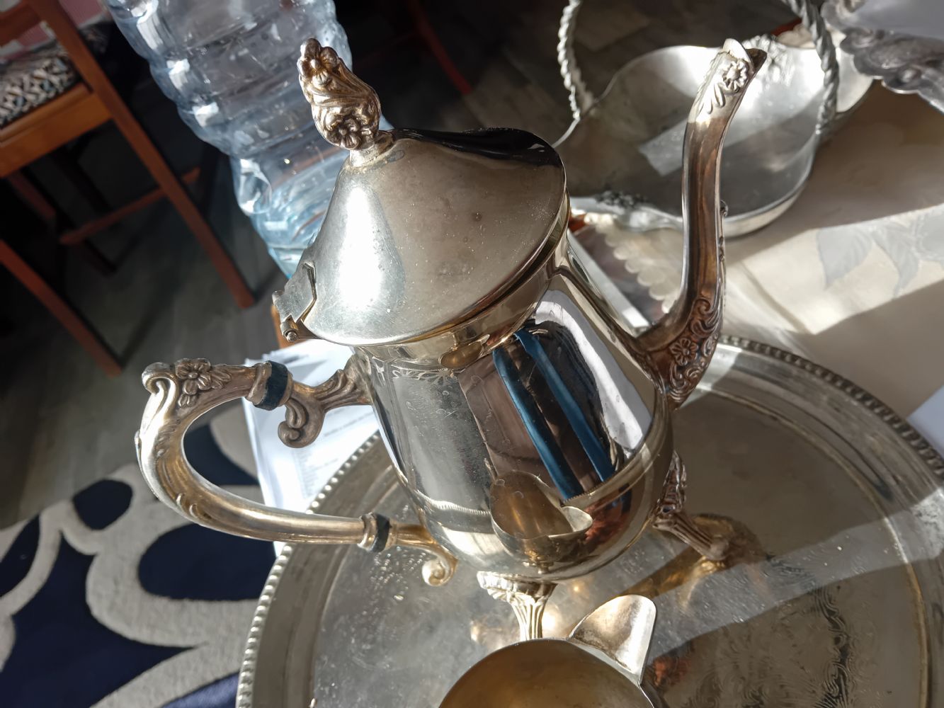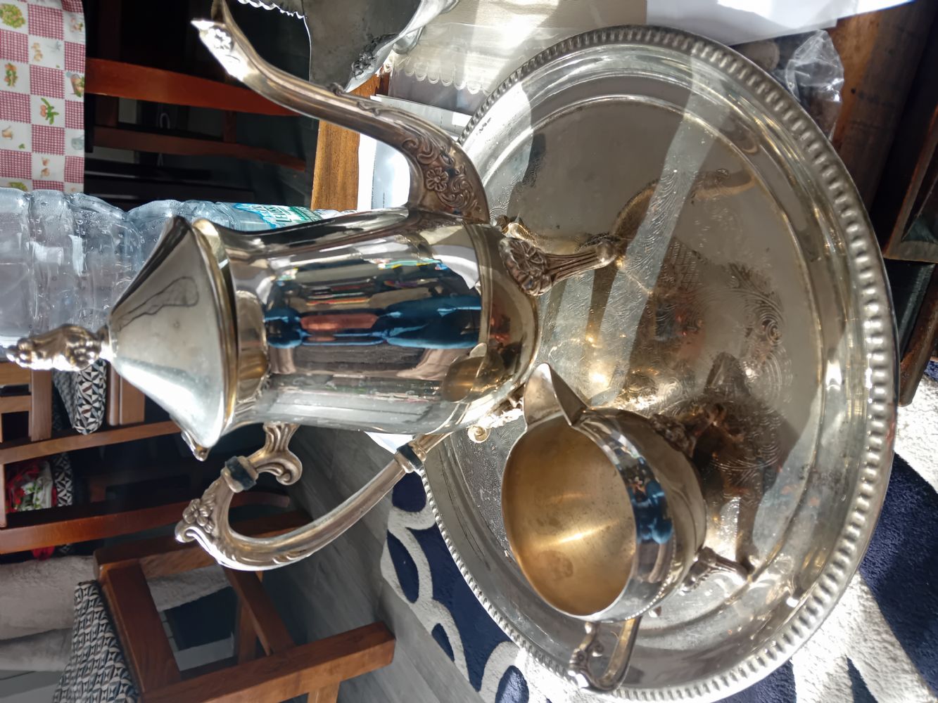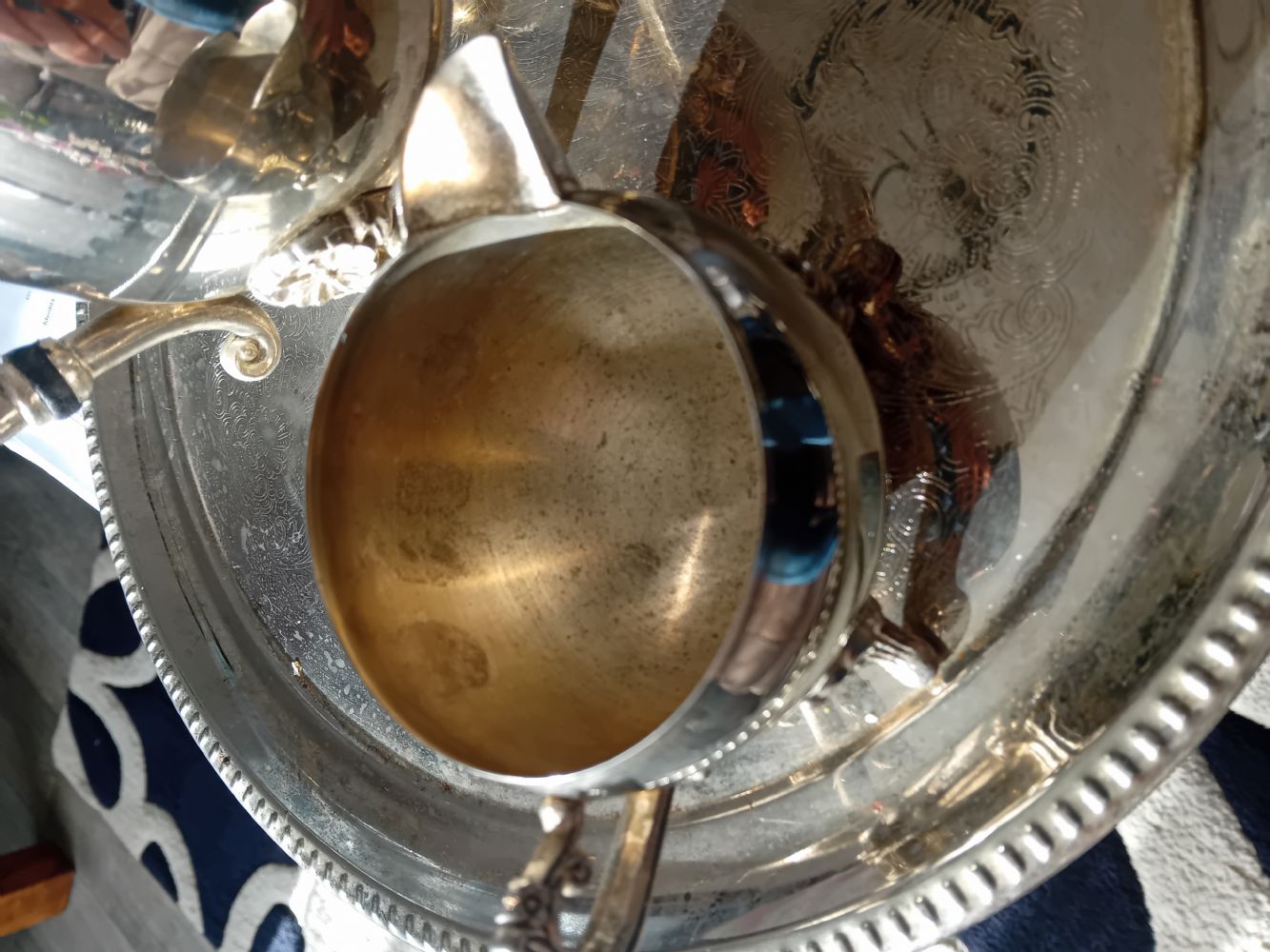 Descrizione:Tutti e 3 i pezzi vassoio lattiera e teira non ho la possibilità di misurare ho messo vicino una bottiglia per darvi un idea, bello come oggetto aggiungo foto