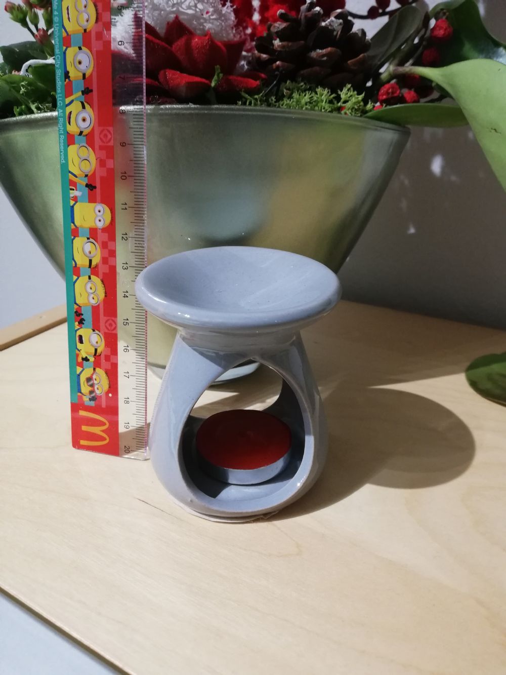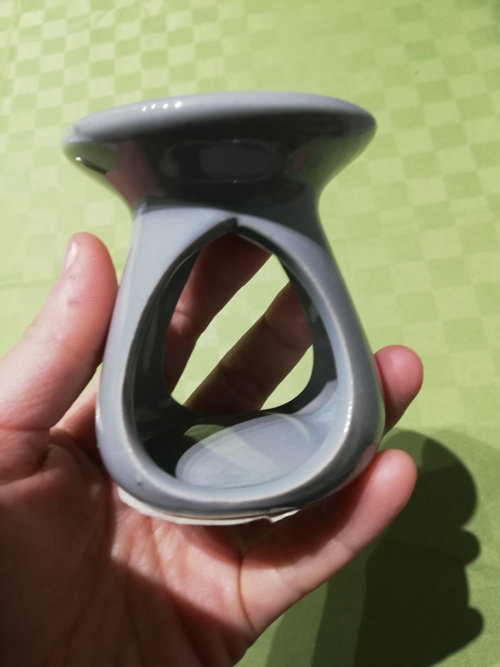 Bruciaessenze grigio in ceramica con candelina.
