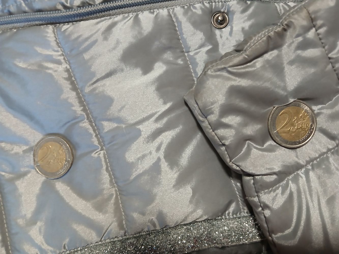 Molto bella, presenta 2 tagli. Ricopribili con delle applicazioni dove ho messo le monete