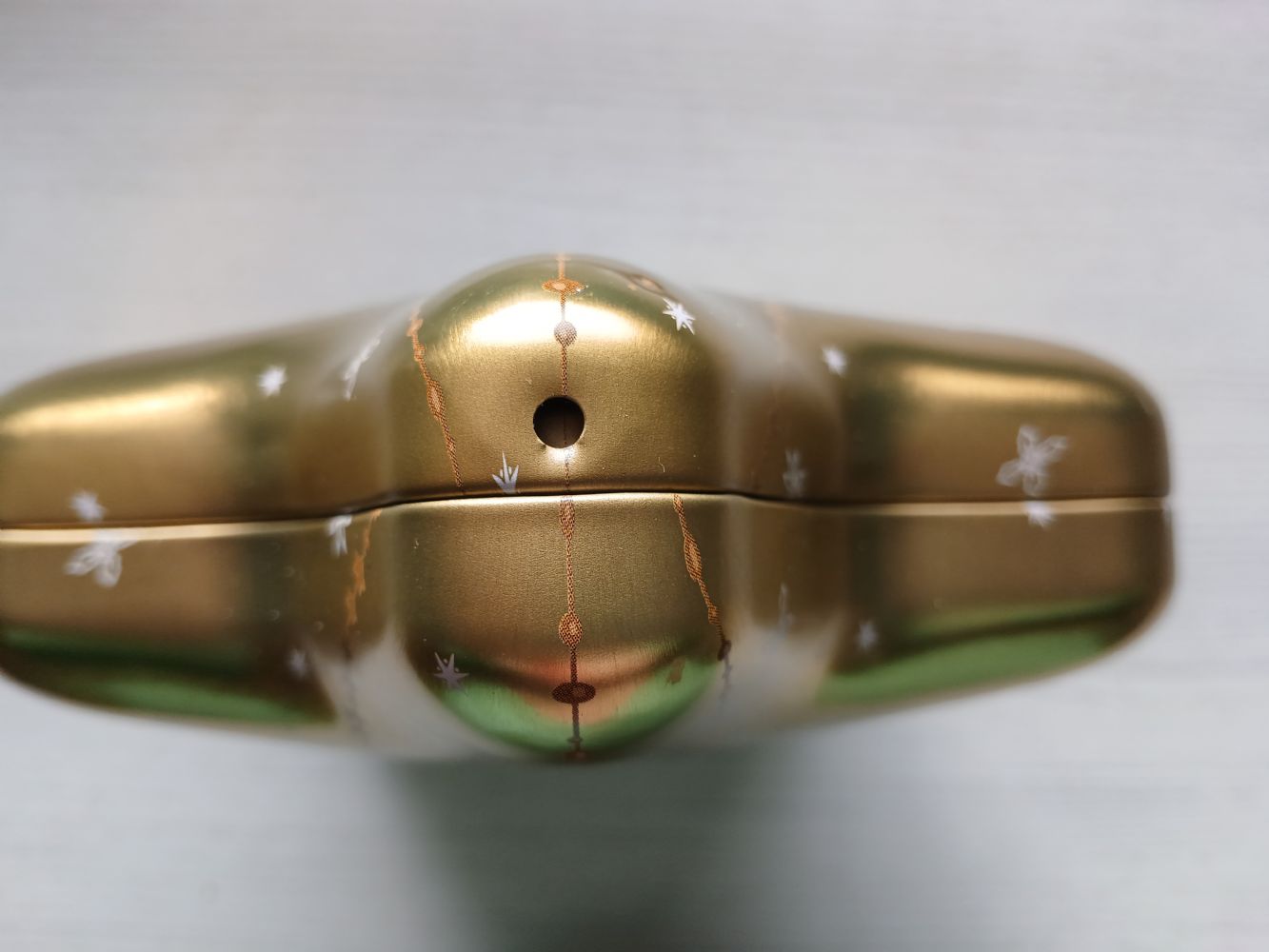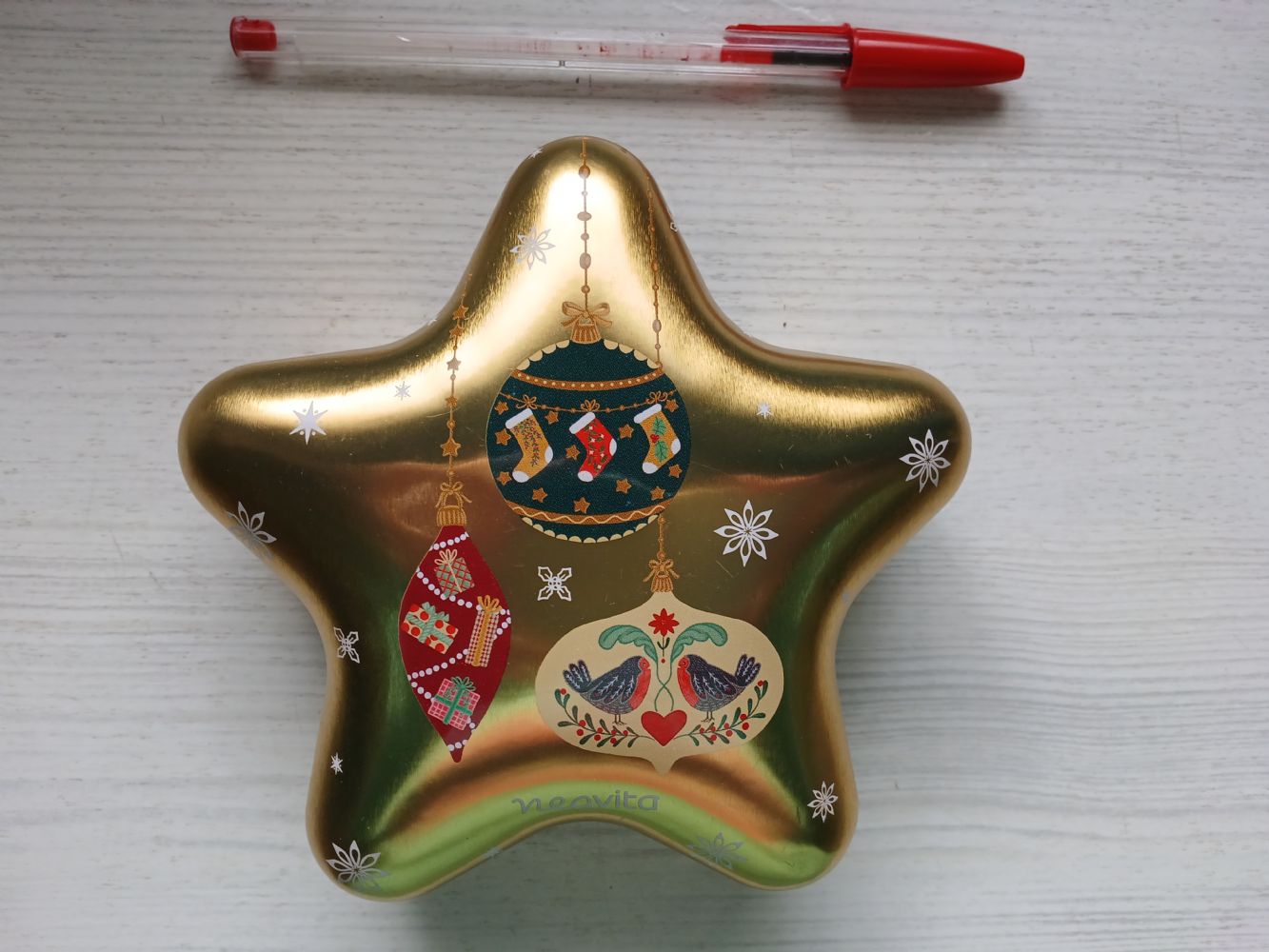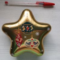Descrizione:Scatola di latta che conteneva tisane, si apre e sopra una punta presenta un foro per poter inserire uno spago, così può essere usata sull'albero di natale.