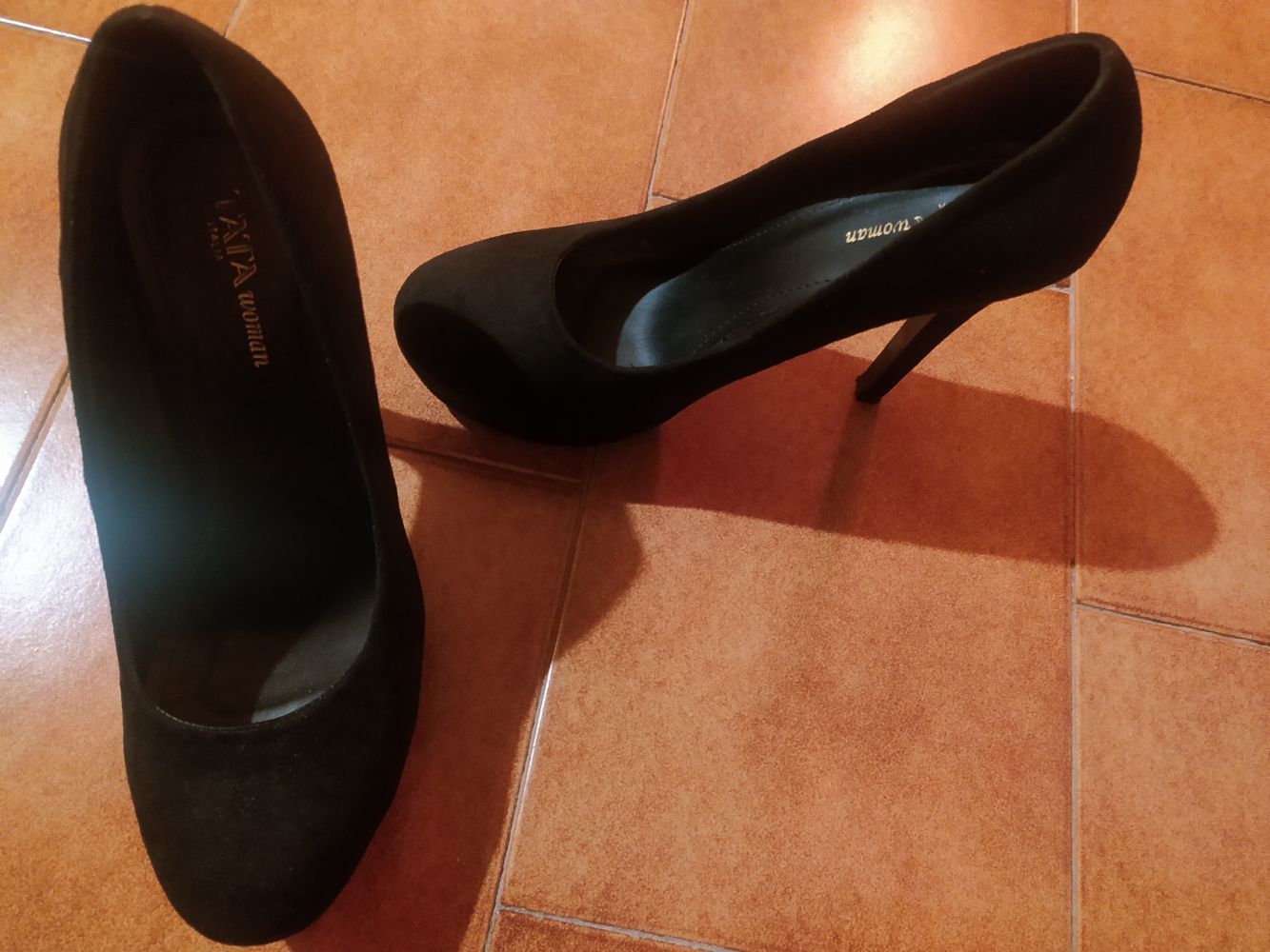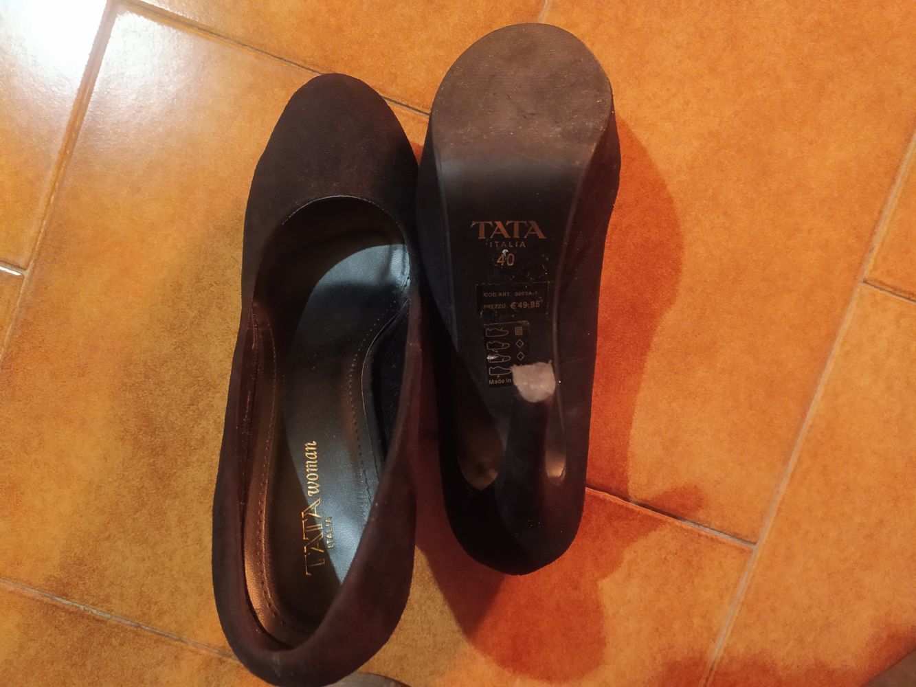 Sintetico e gomma, esterno tipo camoscio, tacco 13,5, plateau 3,5, dunque altezza 10. Con un paio di tacchi extra.