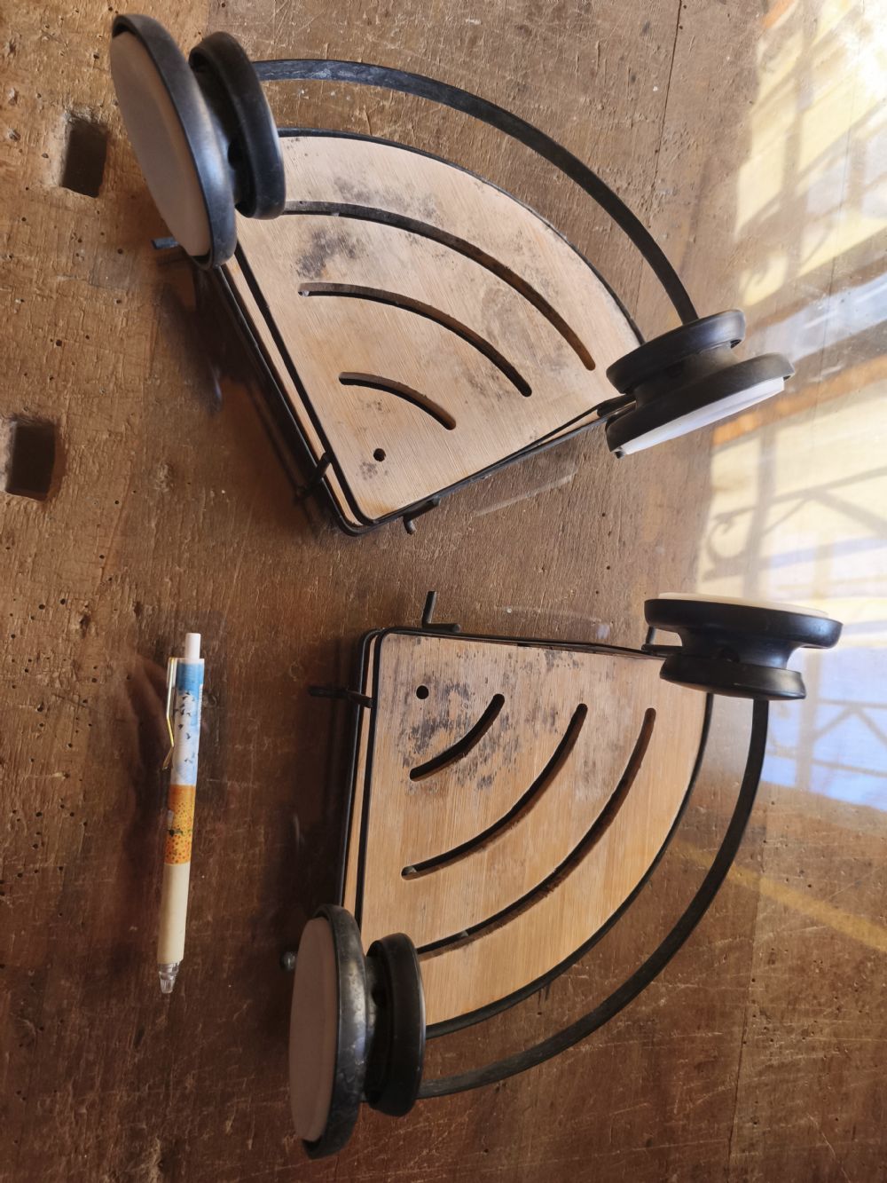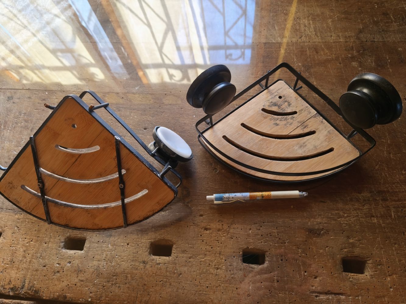In metallo e bambù, con ventose per non bucare le piastrelle. Una parte dei ripiani in bambù è diventata scura.