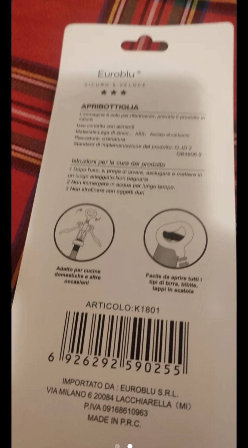 Descrizione:Apribottiglie Euroblu, nuovo e ancora nella confezione originale. Solo aperta mai utilizzato. È realizzato in metallo, ha un colore argento e un design elegante.