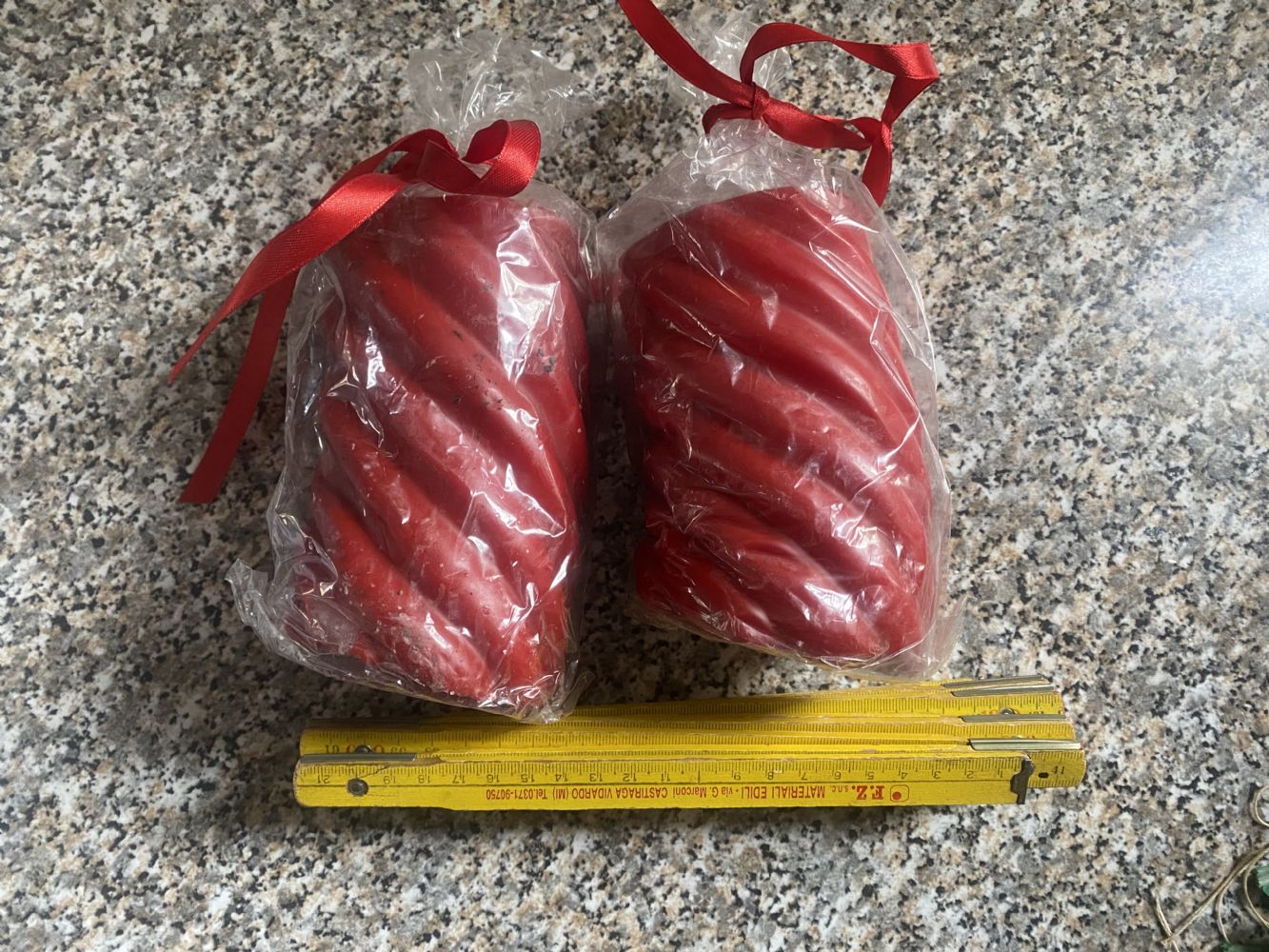 Descrizione:Due grosse candele natalizie tortili mangiafumo, nuove, ma purtroppo deformate, utile x recupero cera