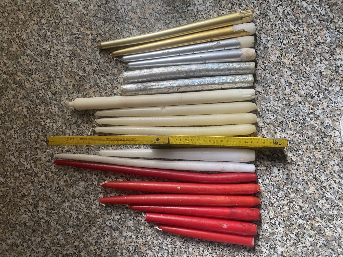 Descrizione:Candele assortite, un credito cadauna, tutte intere tranne una (quella lunga color panna)