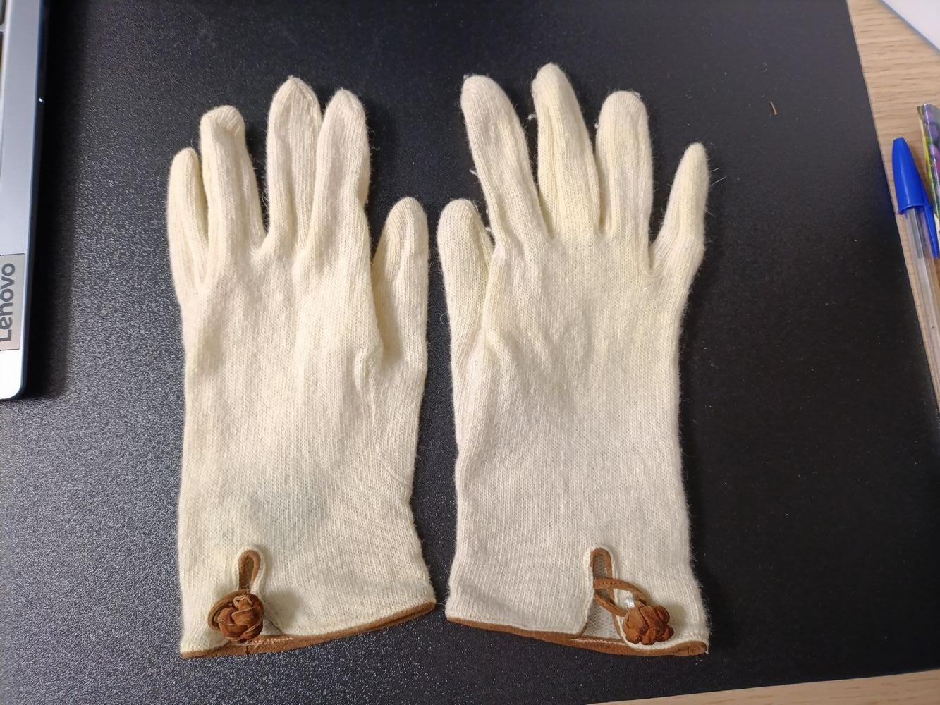Descrizione:Guanti da donna 80% lana 20% angora, con bordino e bottone in pelle scamosciata. Misura media (dovrebbe essere un 7 1/2-8). Qualche pallino sul guanto destro ma ancora molto sfruttabili ed eleganti