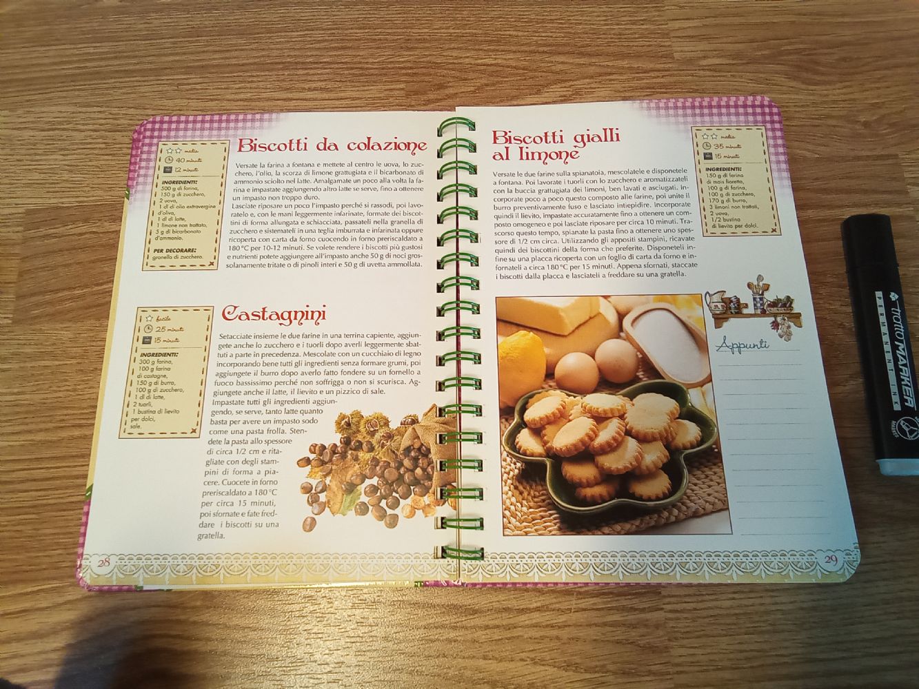 Libro di ricette di biscotti e pasticcini. Copertina rigida e spirale per la rilegatura. Interno a colori