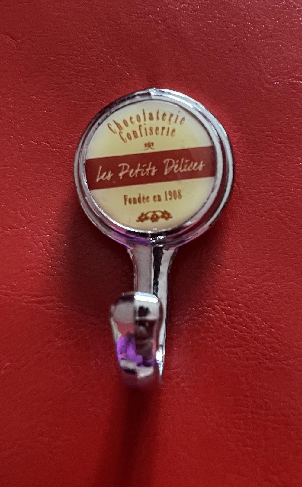 Descrizione:Gancio decorativo con calamita, ideale per appendere piccoli oggetti. Il design presenta la scritta Chocolaterie Confiserie Les Petits Délices e Fondée en 1908.