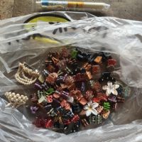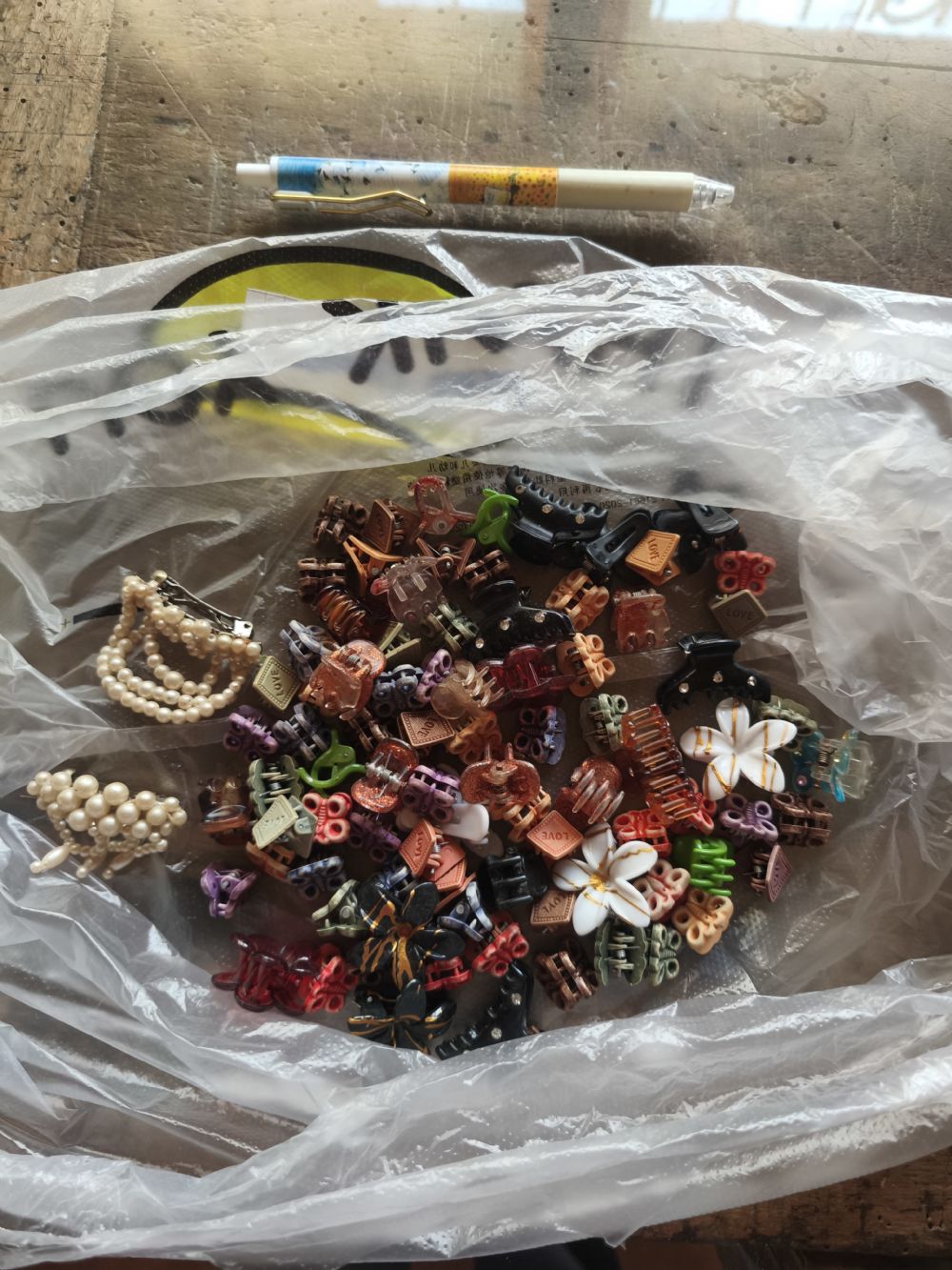 Un sacchetto pieno di mollettine per capelli di vario tipo, vari colori, in plastica.