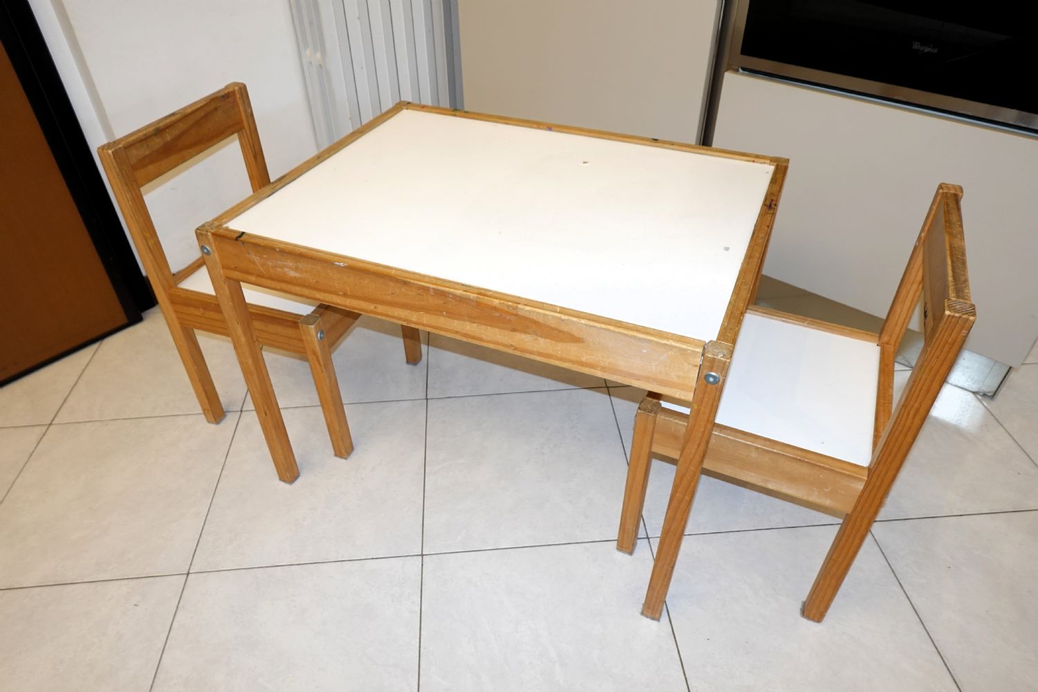 Descrizione:Tavolino ikea con due sedie di legno di pino per bambini (taglia OK fino a 6/7 anni). Ideali per i lavoretti artistici ma anche come tavolo per mangiare in caso di giovani ospiti.